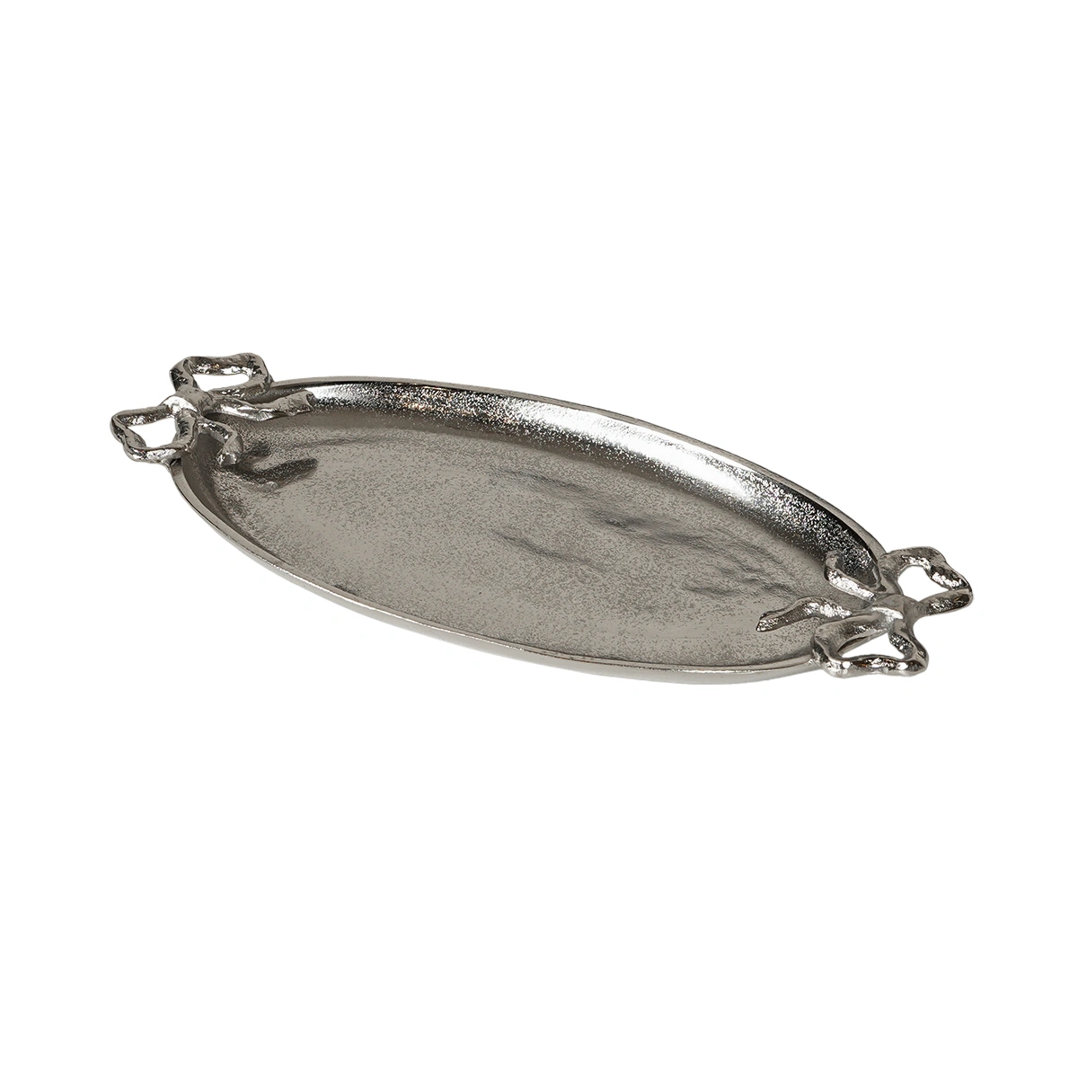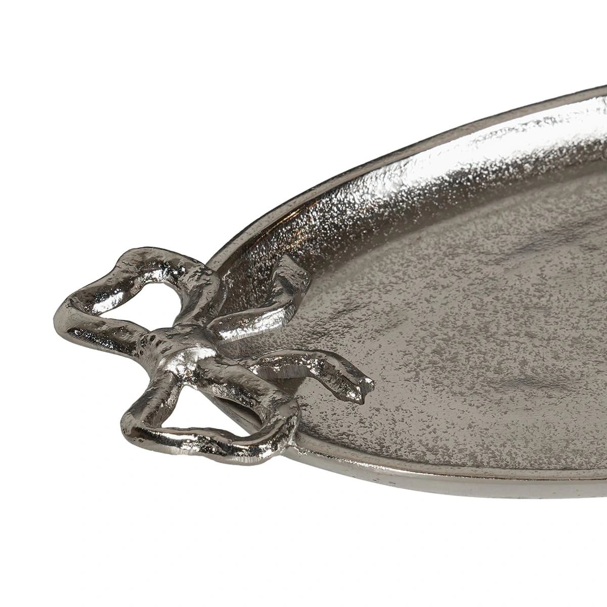 The tray measures 47 cm in length, 22.5 cm in width and stands 3.5 cm high. Its raw silver finish lends a sophisticated charm to its sturdy aluminium base. The design features an oval shape with bow handles, making it an attractive yet functional piece.