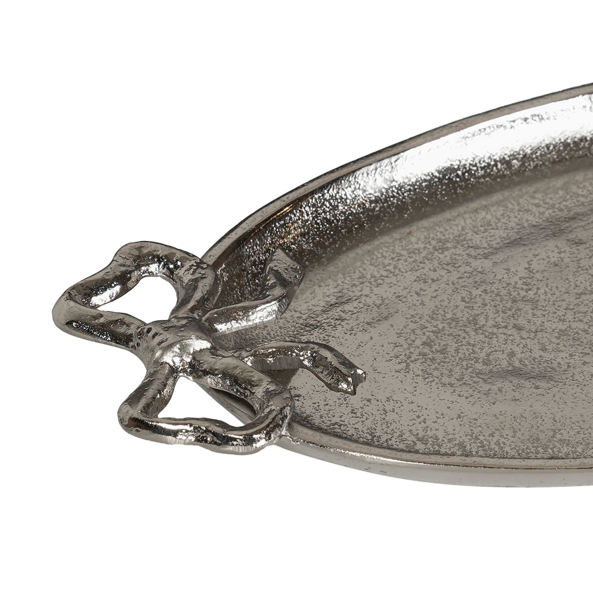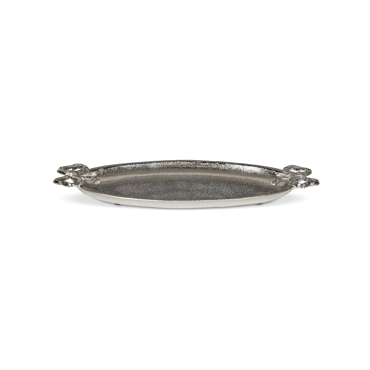 Oval Bow Handle Tray Small in Raw Silver blends function with elegance. Ideal for serving or displaying décor, it adds subtle shine and refinement to dining tables, bars, or vanities.