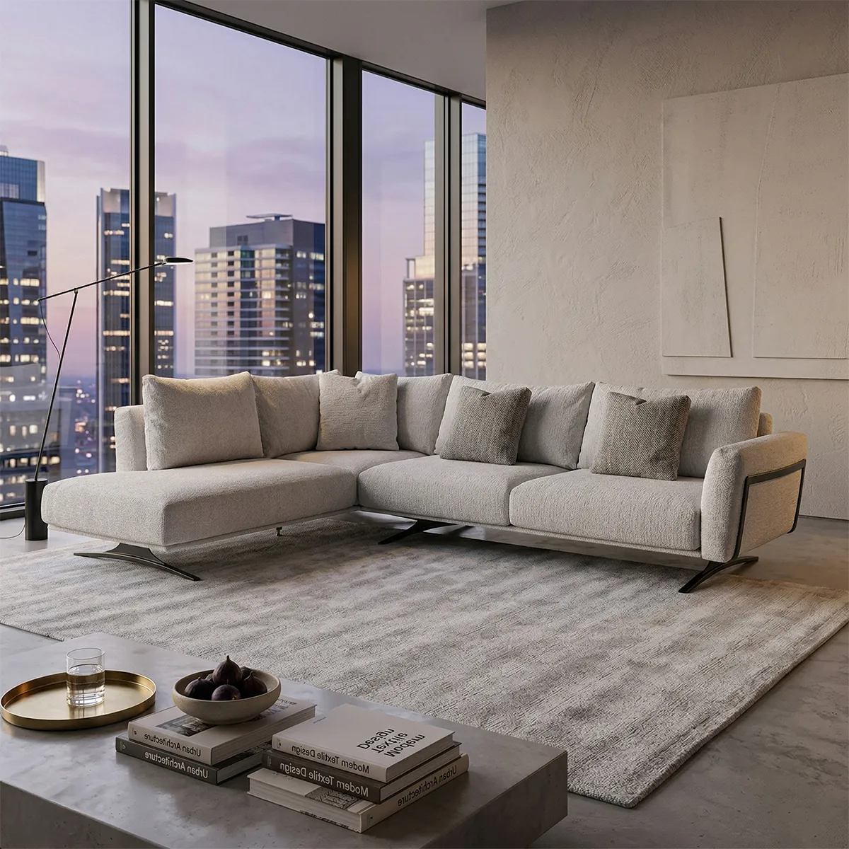 | Material: | Fabric on sofa: 6005 Blaze (59%PL - 41%PC) Fabric on extra cushions: 6010 Prazzo (57%PC-42%PL-1%VI); Back cushion filling: goose feathers and silicone blend; Frame: pine wood, plywood Support of armrest -painted steel; Legs: metal legs col.20 |