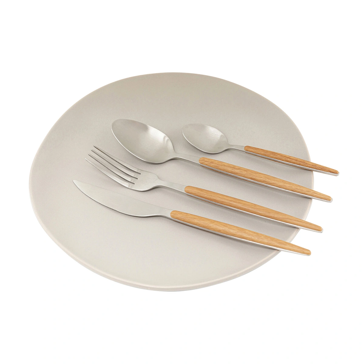 The Paris Nature cutlery set enhances dining tables with a modern matte silver finish and practical design. Ideal for everyday meals and gatherings, this 16-piece dining cutlery collection combines elegance with functional usability. Designed with ABS handles and lacquered stainless steel bodies, each piece offers durability, comfortable grip, and resistance to daily wear. The balanced weight and refined finish suit both casual dining and formal table settings.