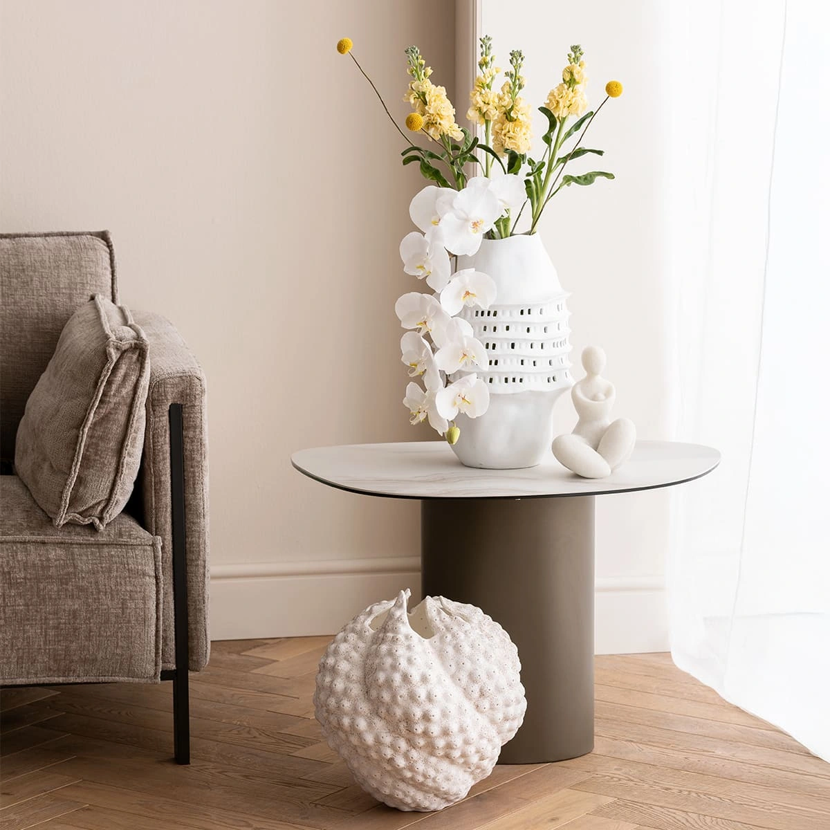 This side table combines modern design with practical functionality and sets stylish accents in any room. With its table top made of high-quality ceramic and toughened safety glass and a sturdy steel frame, it is easy to clean and durable and blends harmoniously into any living concept. Its clear, sculptural design language and understated color scheme make it a versatile piece of furniture that cuts a fine figure in the living room, hallway or bedroom. Whether as a storage surface for decorative items or as a practical table next to the sofa - the side table impresses with its timeless elegance and functionality.