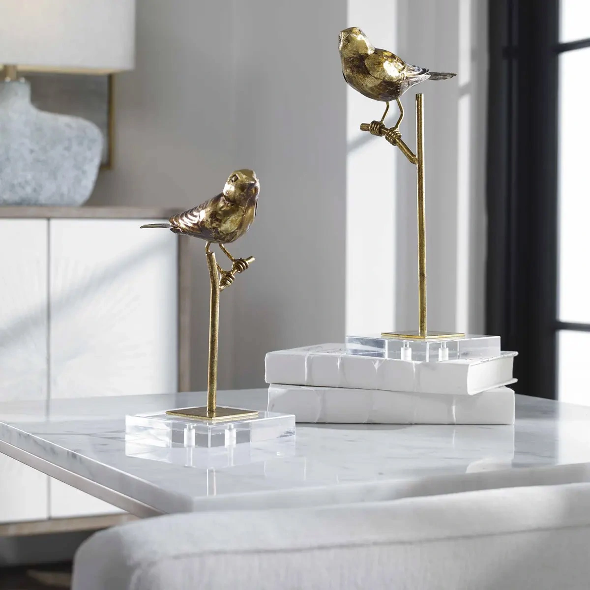 Add a touch of elegance to your home decor with the Golden Antiqued Gold Leaf Passerines Figurines Set of 2 by Uttermost. These intricate figurines are a testament to masterful design and craftsmanship.