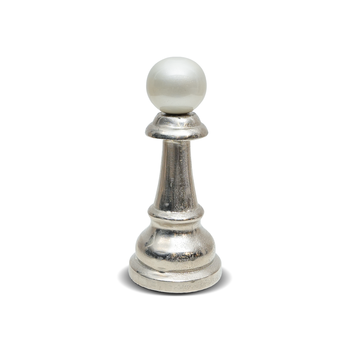 Pawn Chess Figurine with White Ball in Raw Silver adds a creative accent to any interior. Its sculptural shape and polished finish make it a standout piece for decorative arrangements.