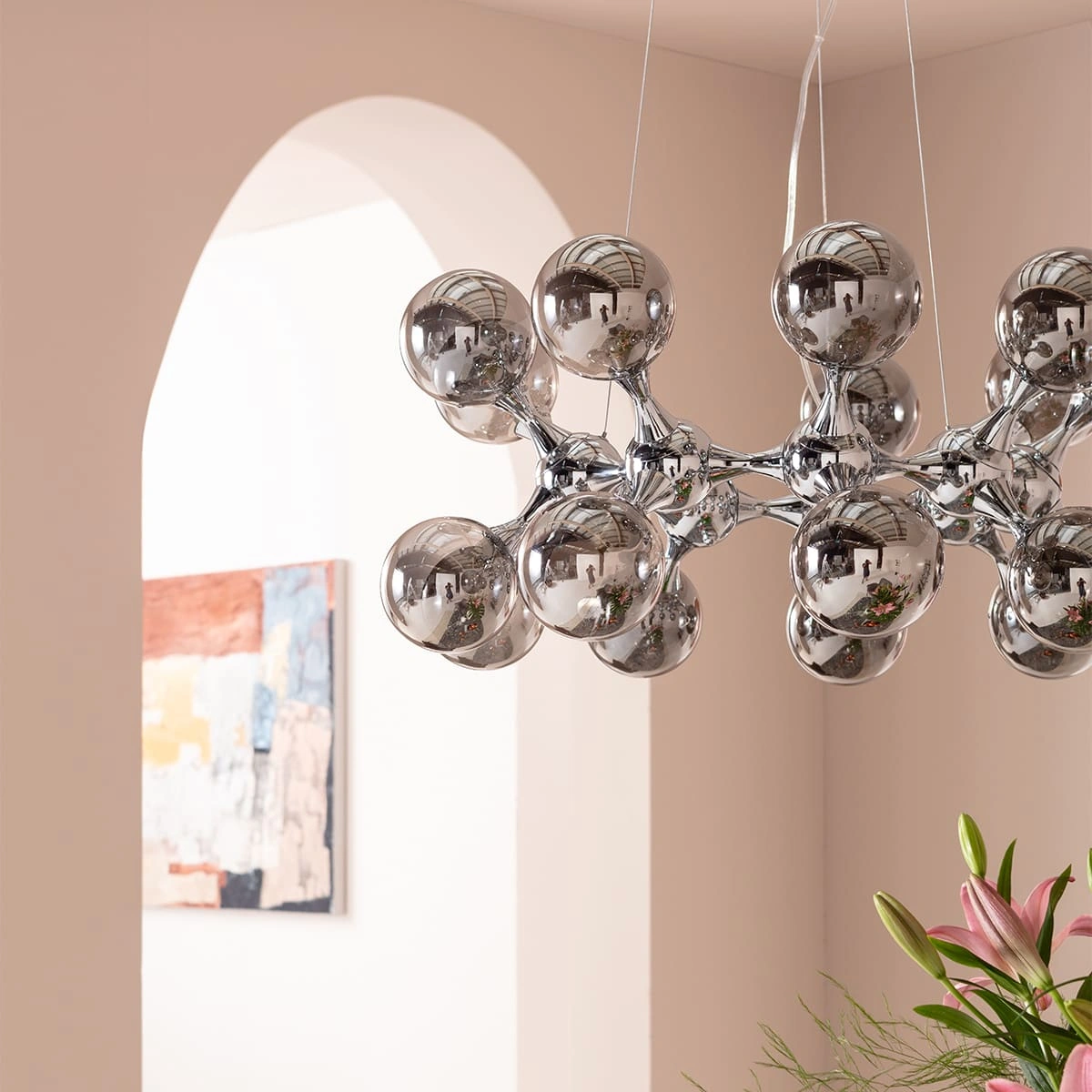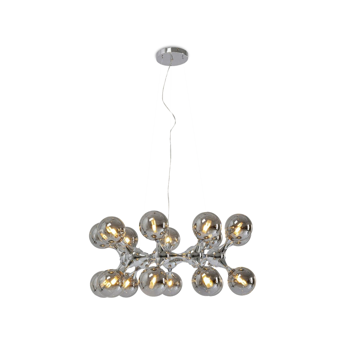 With its 18 glass shades this pendant lamp looks like an avant-garde chandelier. The tinted glass reflects the light sources inside and the surroundings. As a result the height-adjustable pendant lamp unfolds an exciting lighting effect and playfully forms a light sculpture above the dining table, in the bedroom or in the centre of the living room.