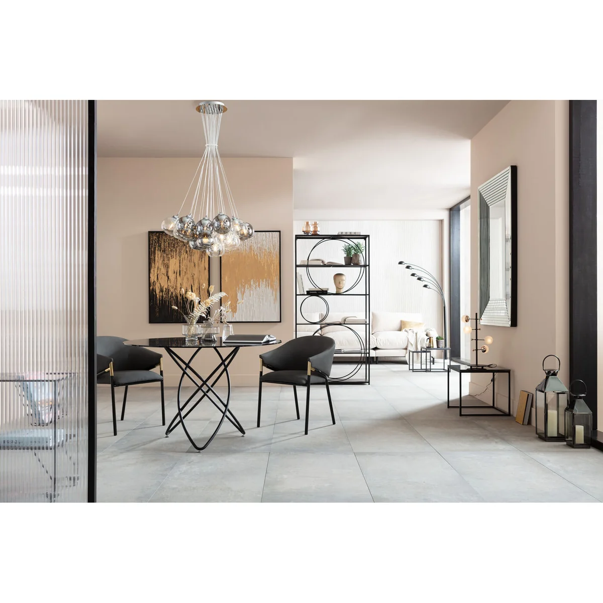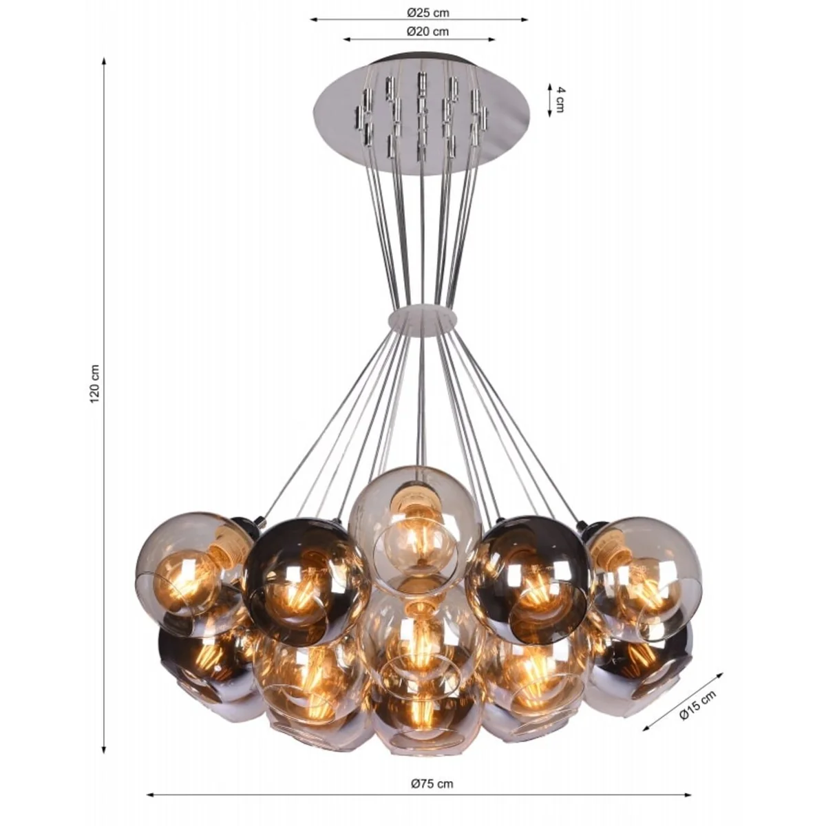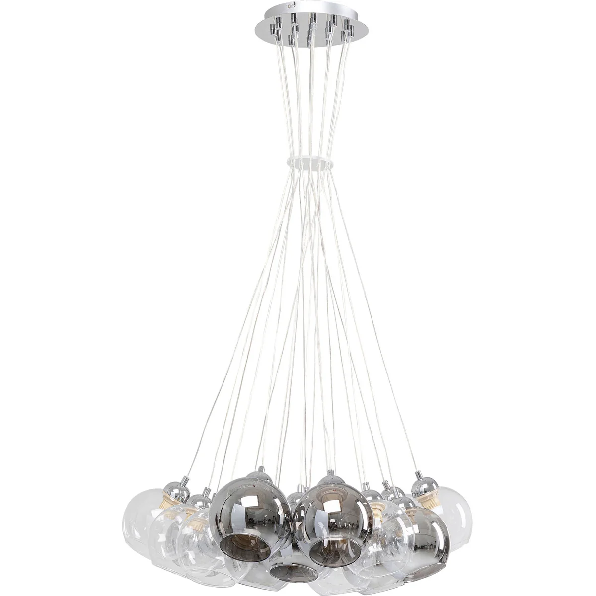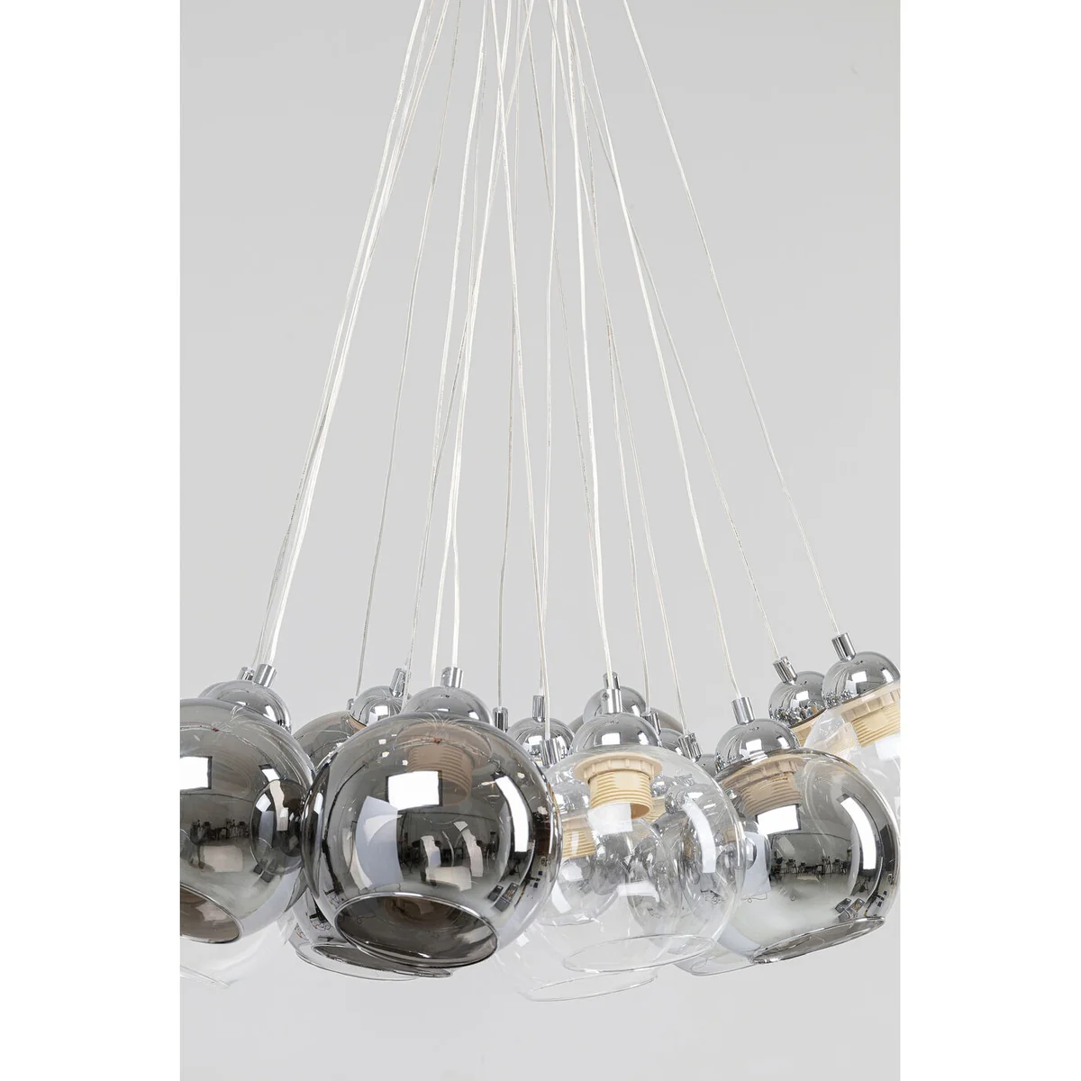Light creates emotions - this eye-catching pendant lamp amplifies them to infinity: the differently coloured glass shades create exciting nuances and reflect the light of their surroundings. This is how the lamp unfolds an exciting lighting effects with seemingly innumerable light sources. In fact, there are 19 glass shades floating on bright plastic-coated cables.