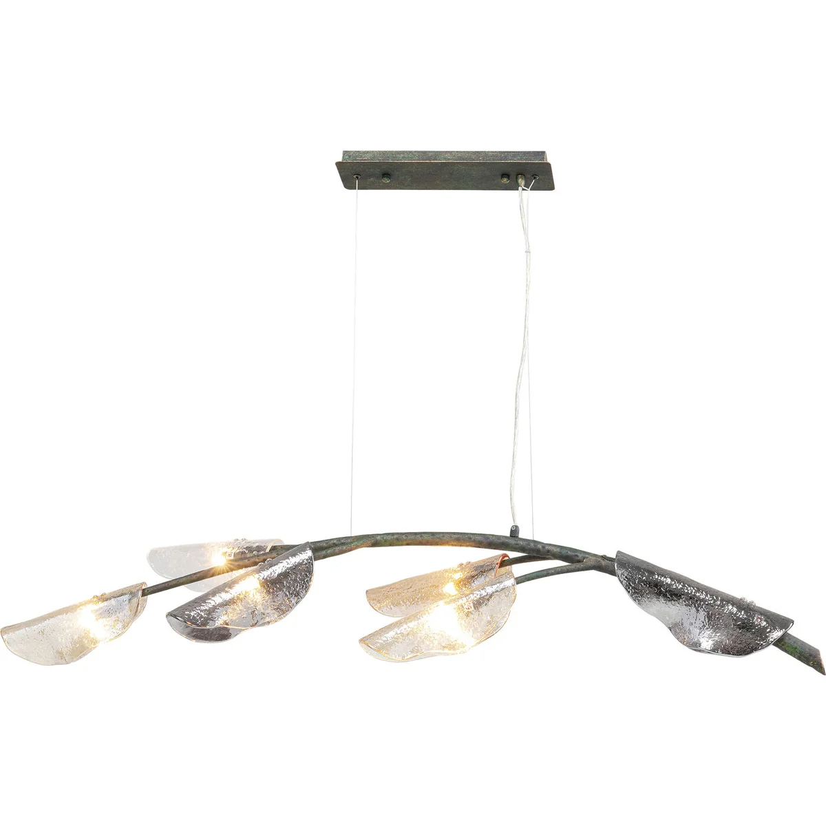 - Exclusive, large pendant lamp in an abstract branched shape with 6 extraordinary lampshades - Wide enough to provide dreamy light above large dining tables or over the kitchen counter - Differently coloured glass shades nestle like petals on the lacquered steel frame - Ideal for high old buildings and large, open rooms: they create a visual point of reference with ease - Fairytale enchantment: with the romantic and at the same time modern decorative lamp you can effortlessly create an extraordinary atmosphere