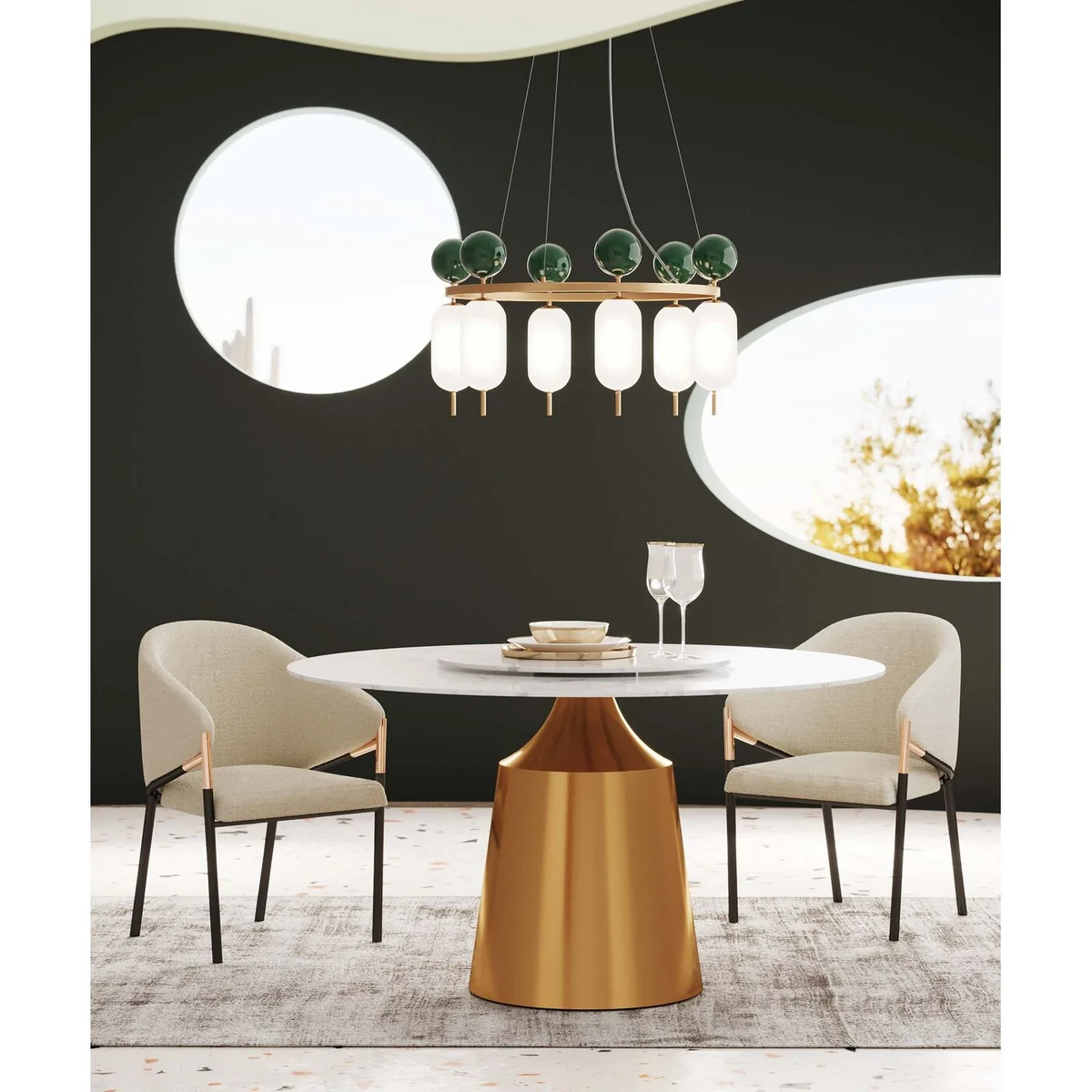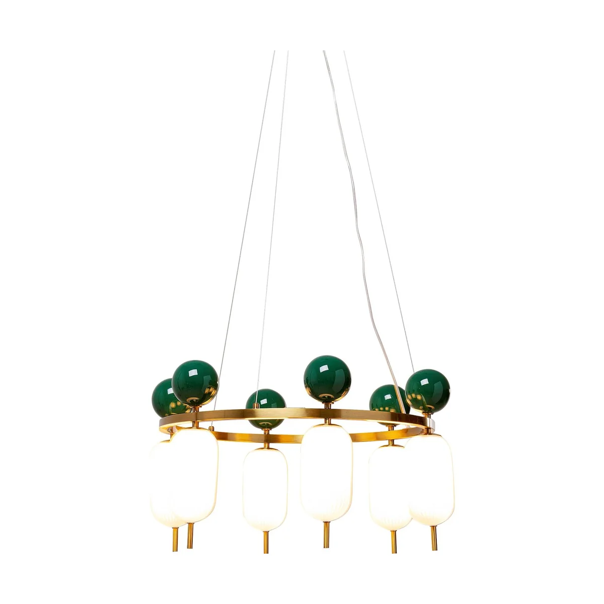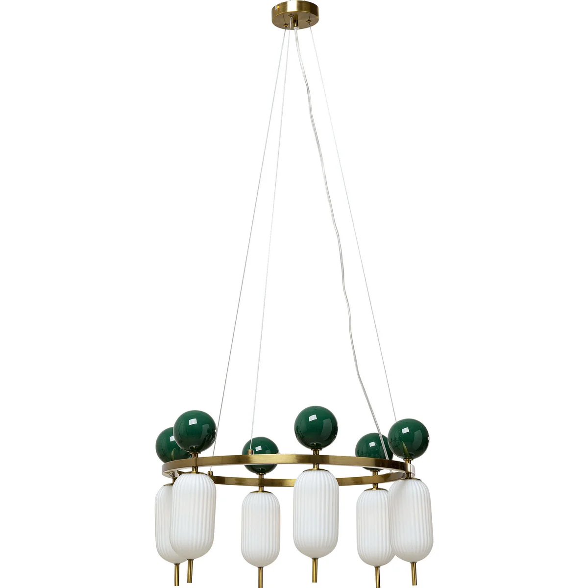 The Charleston pendant lamp makes a particularly stylish addition to your interior. With its six creatively shaped glass shades, the green spheres above and the golden, titanium-coated metal canopy, it sets unique highlights in the room. The height adjustability of the lamp makes it a versatile lighting solution wherever it is placed. The pendant lamp is supplied assembled and is ready for immediate use. Its modern and unique design makes it a real eye-catcher for the dining room, living room or hallway.