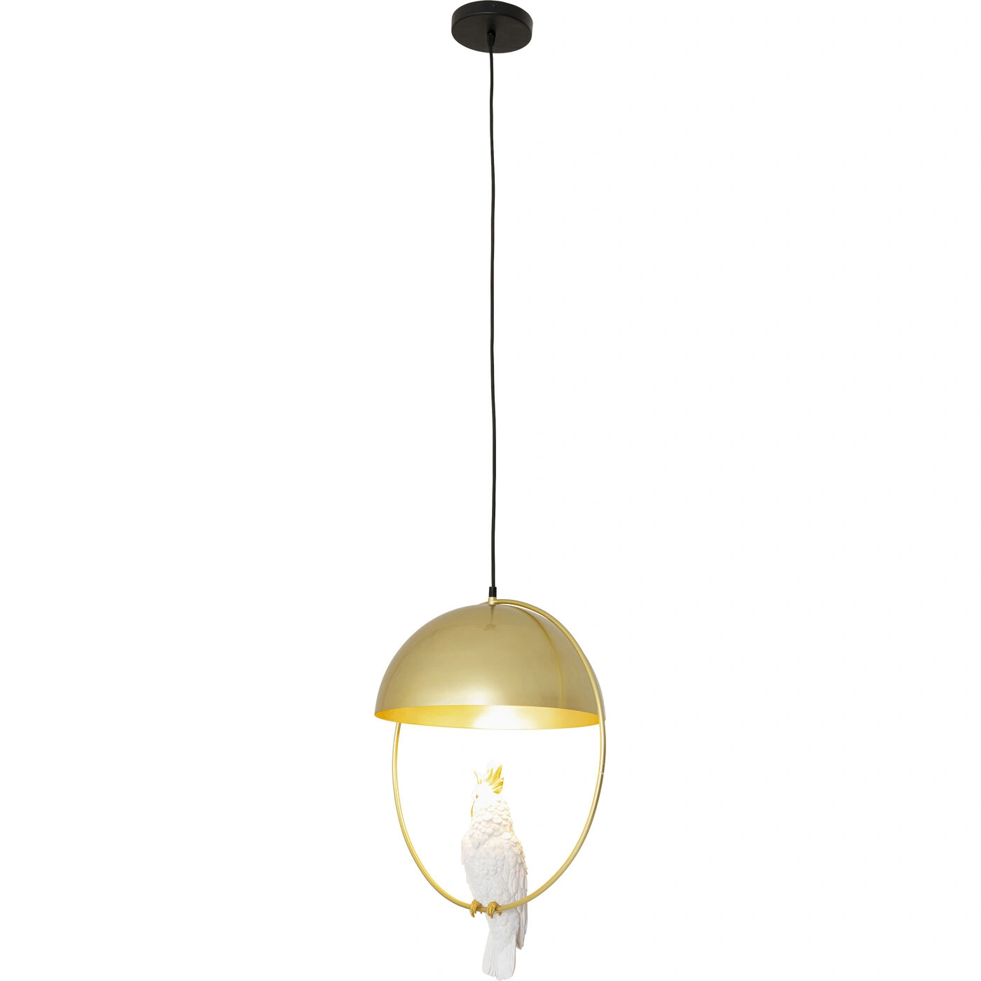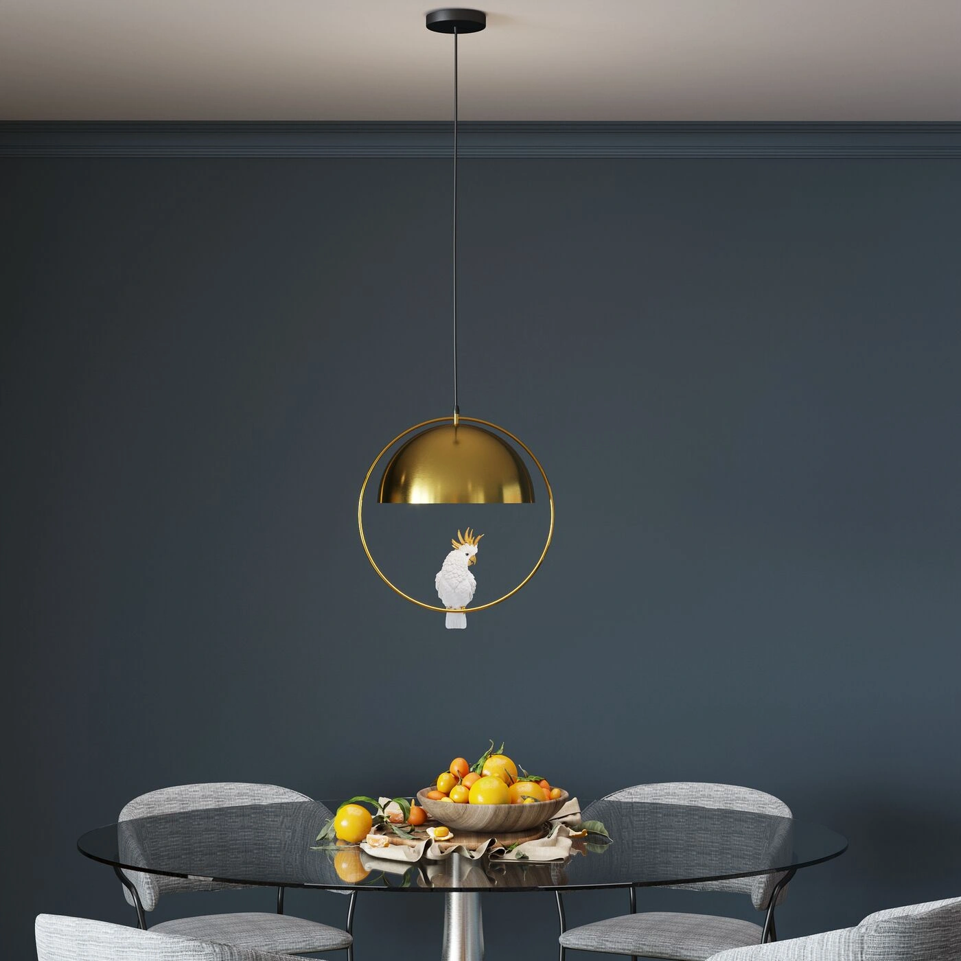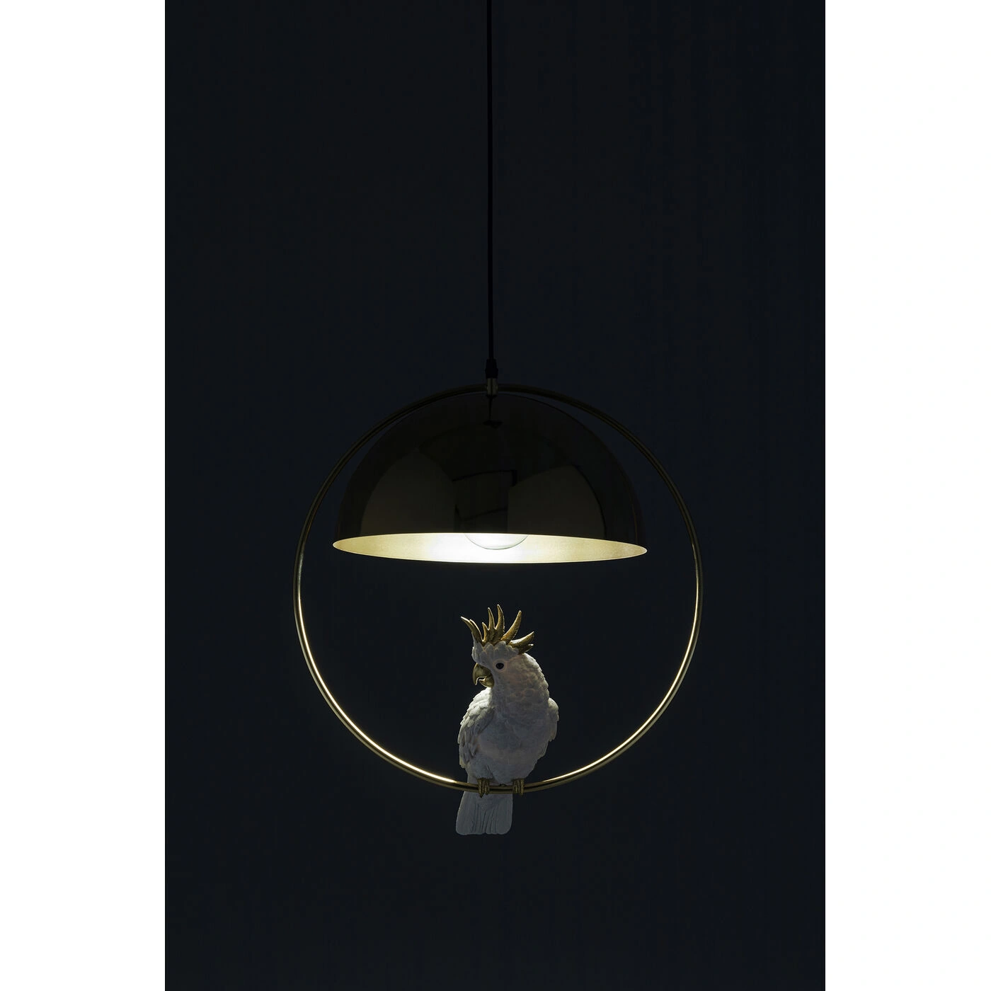 • This pendant lamp will really fly! A pretty cockatoo swings under the round shade in gold