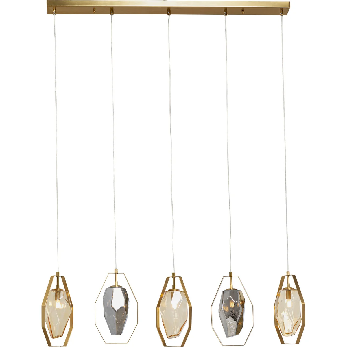 With its size and elongated shape, this golden pendant lamp is ideal as lighting above the dining table. Spectacular pendant lamps can add an extraordinary touch to any room and are a real attention-getter. With its classy design and shades made of glass, this lamp sets stylish highlights. Whether in the living room or in the dining area, this pendant lamp is guaranteed to become the focal point of your interior. Get this unique accessory now and add a real eye-catcher to your home.