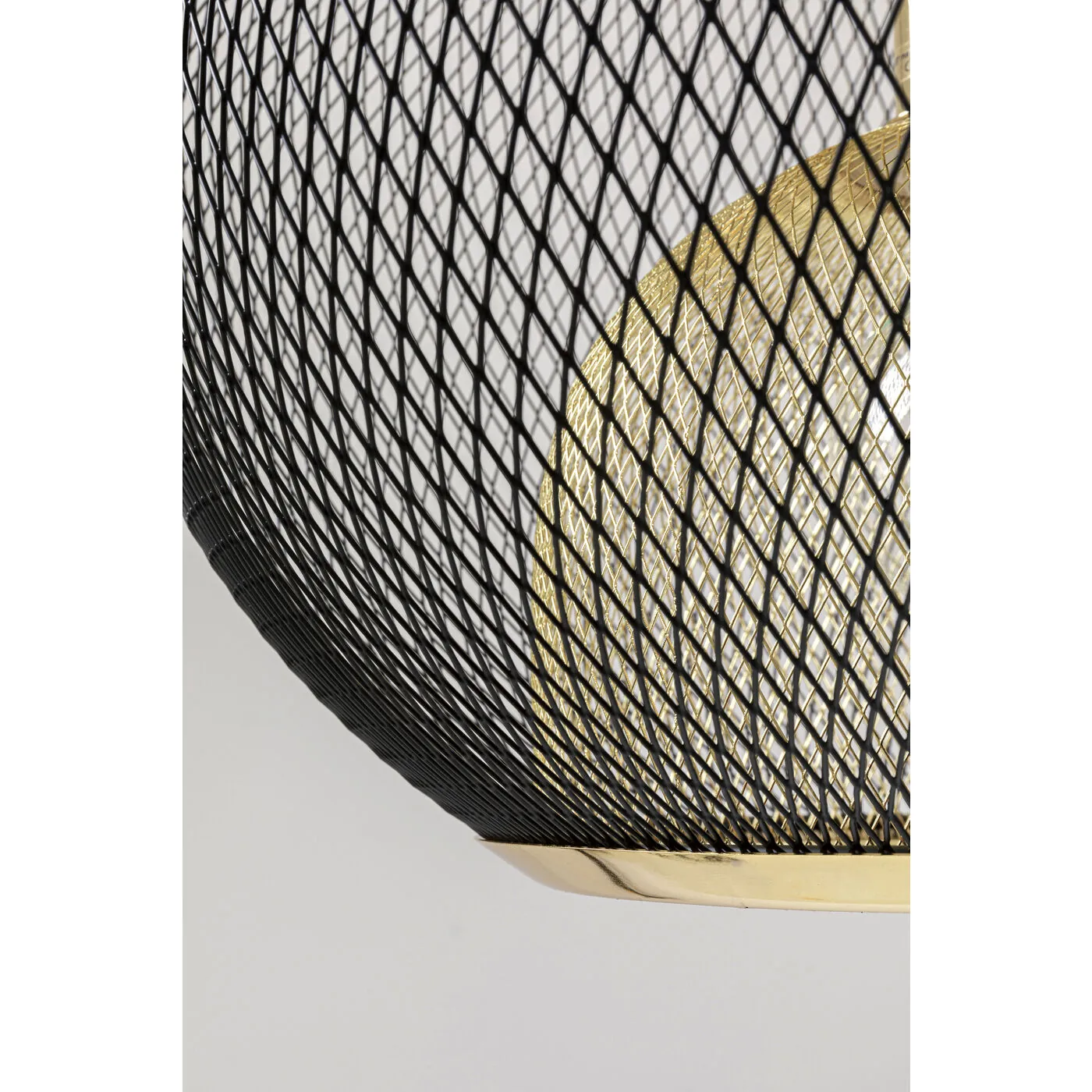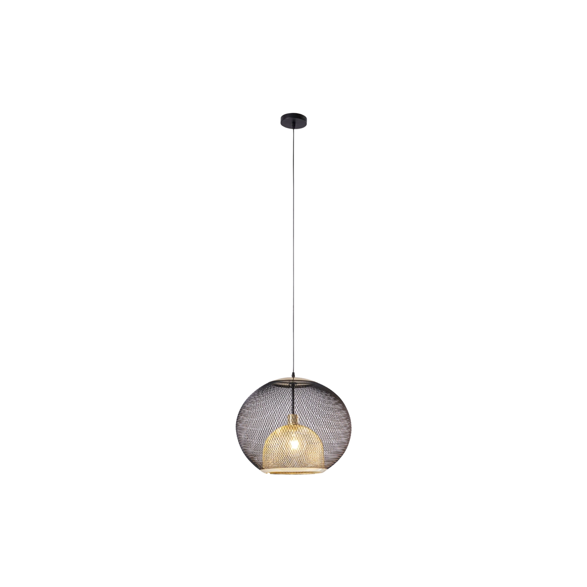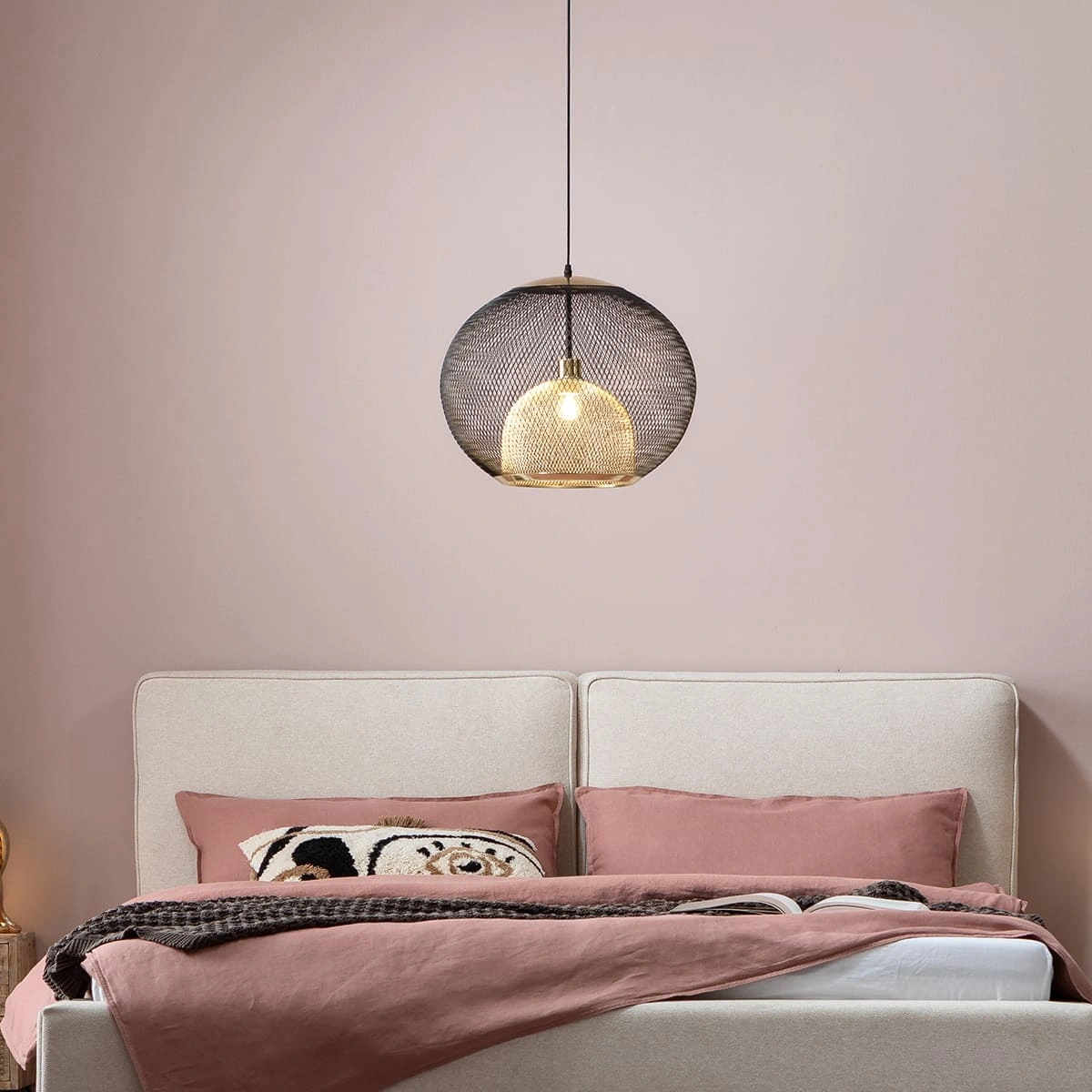 • Simple beauty: a round pendant lamp made of wire mesh in black and gold