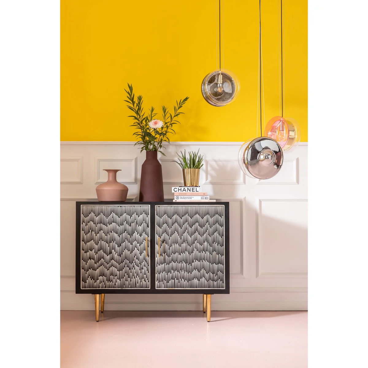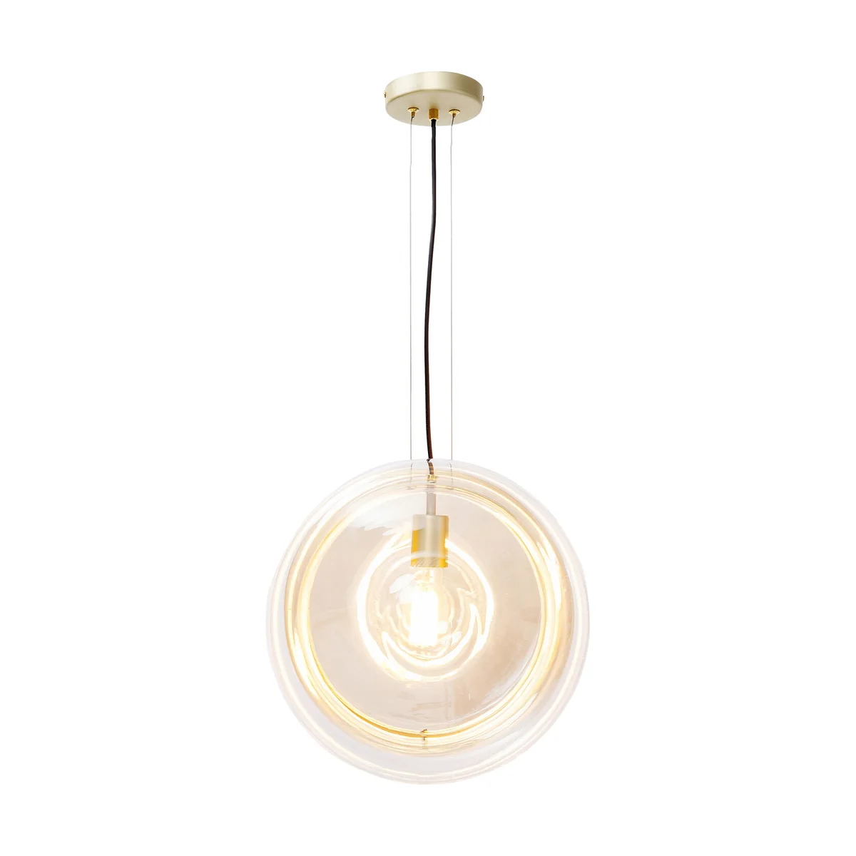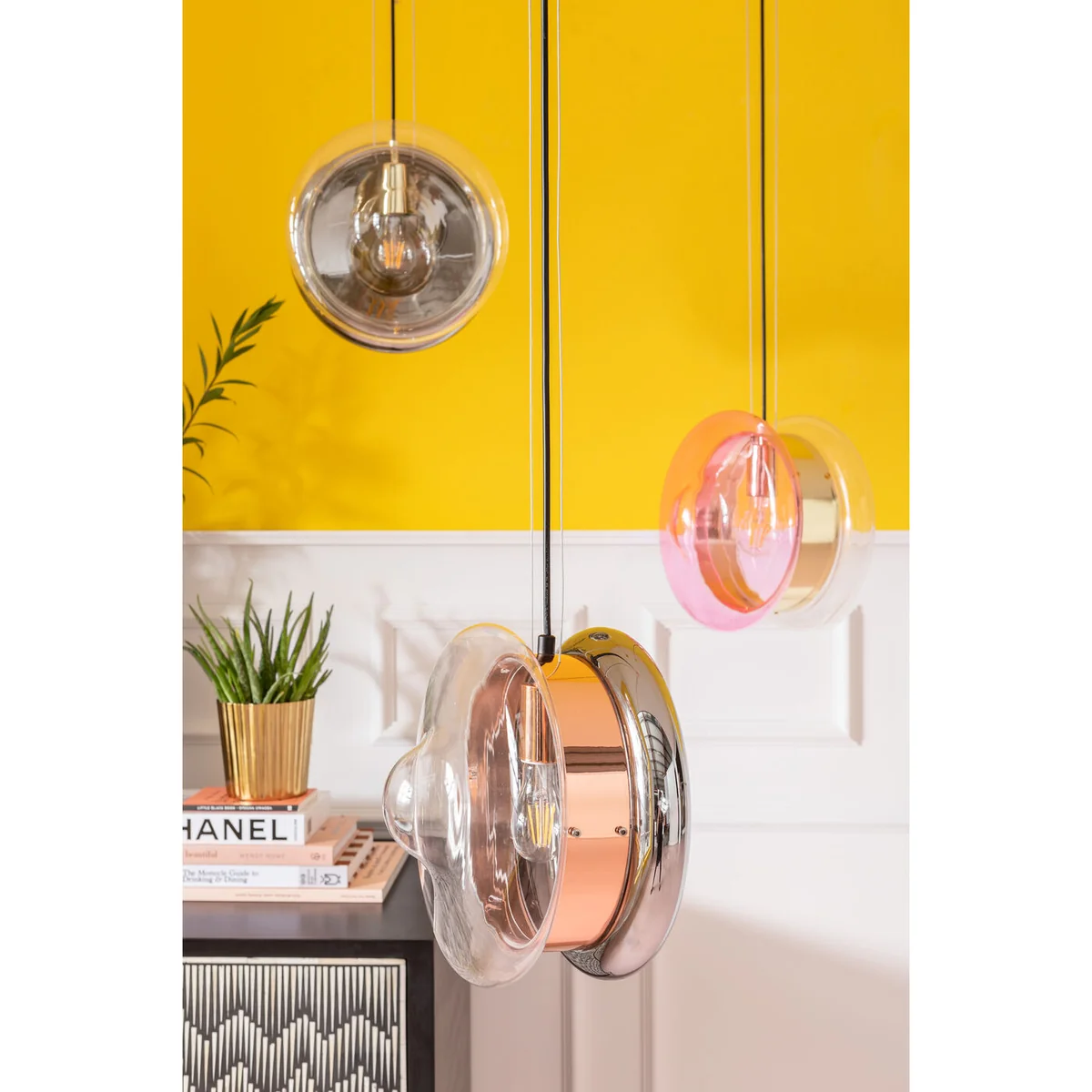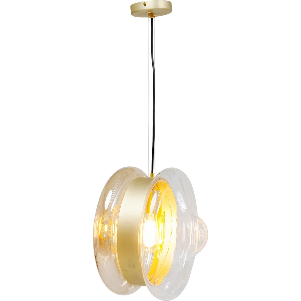 What's that UFO flying over the dining table? A designer lamp whose shape is reminiscent of the yo-yo's from childhood. The unusually shaped glass body has a decorative band in brass colours around its waist. A pendant lamp that goes well with wooden tables, natural stone tabletops or plain colours.
