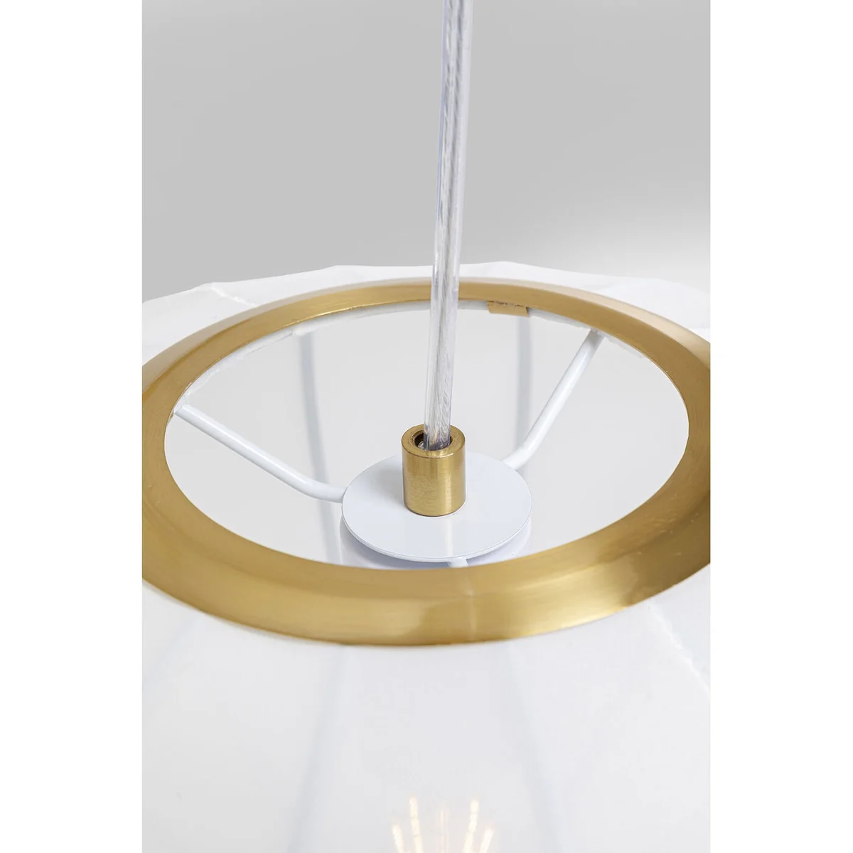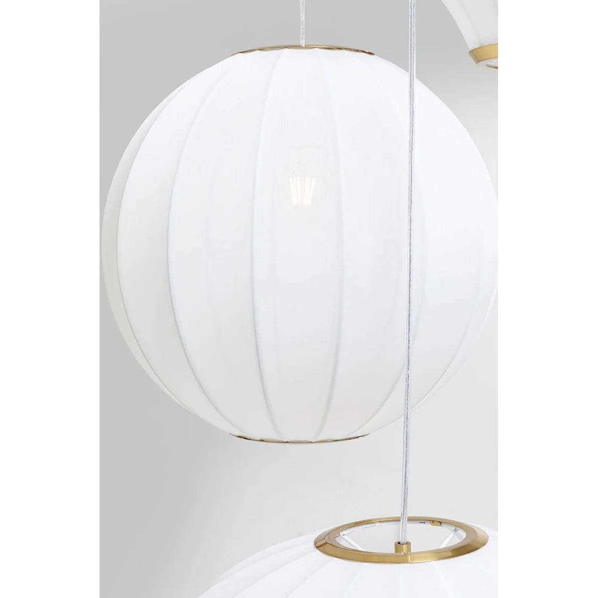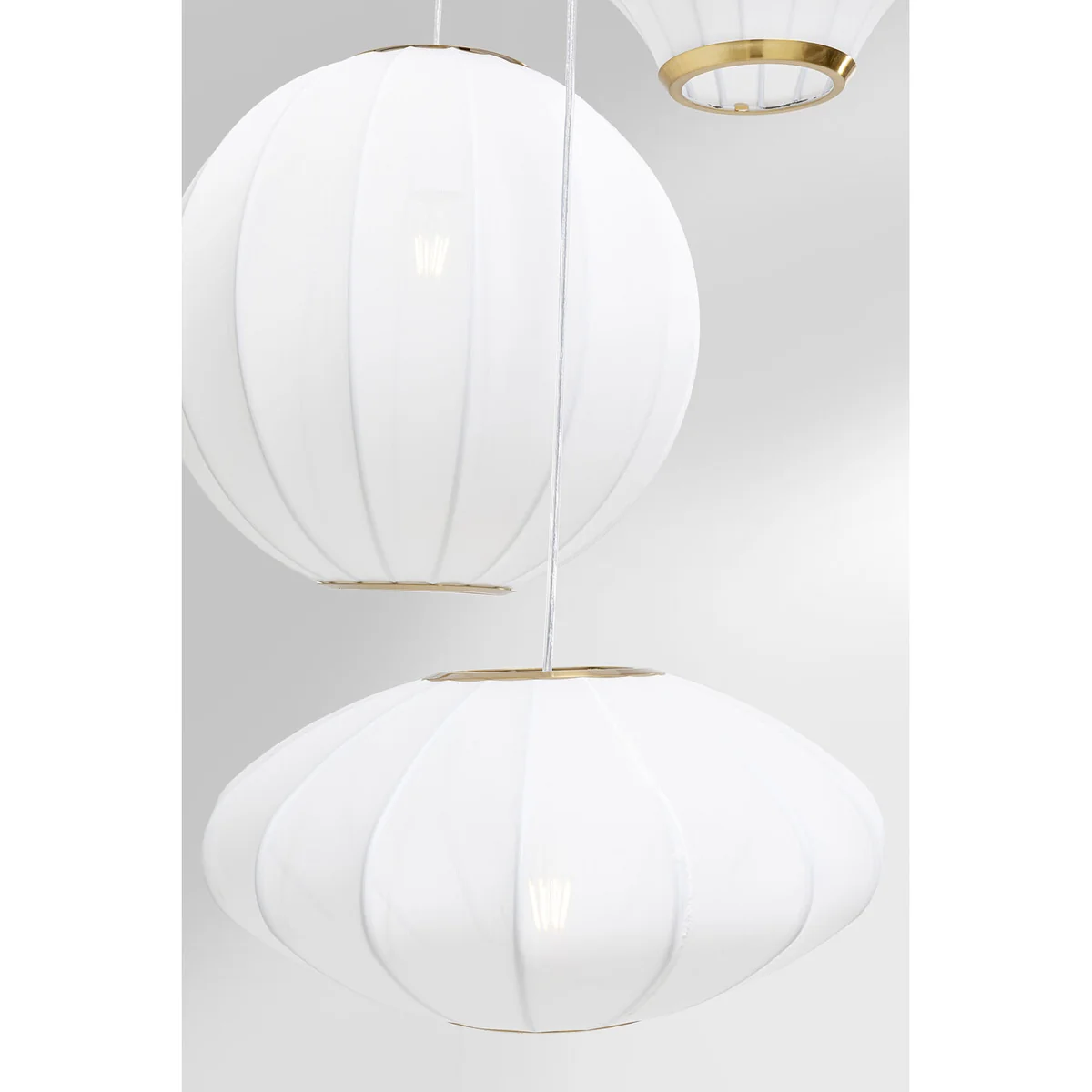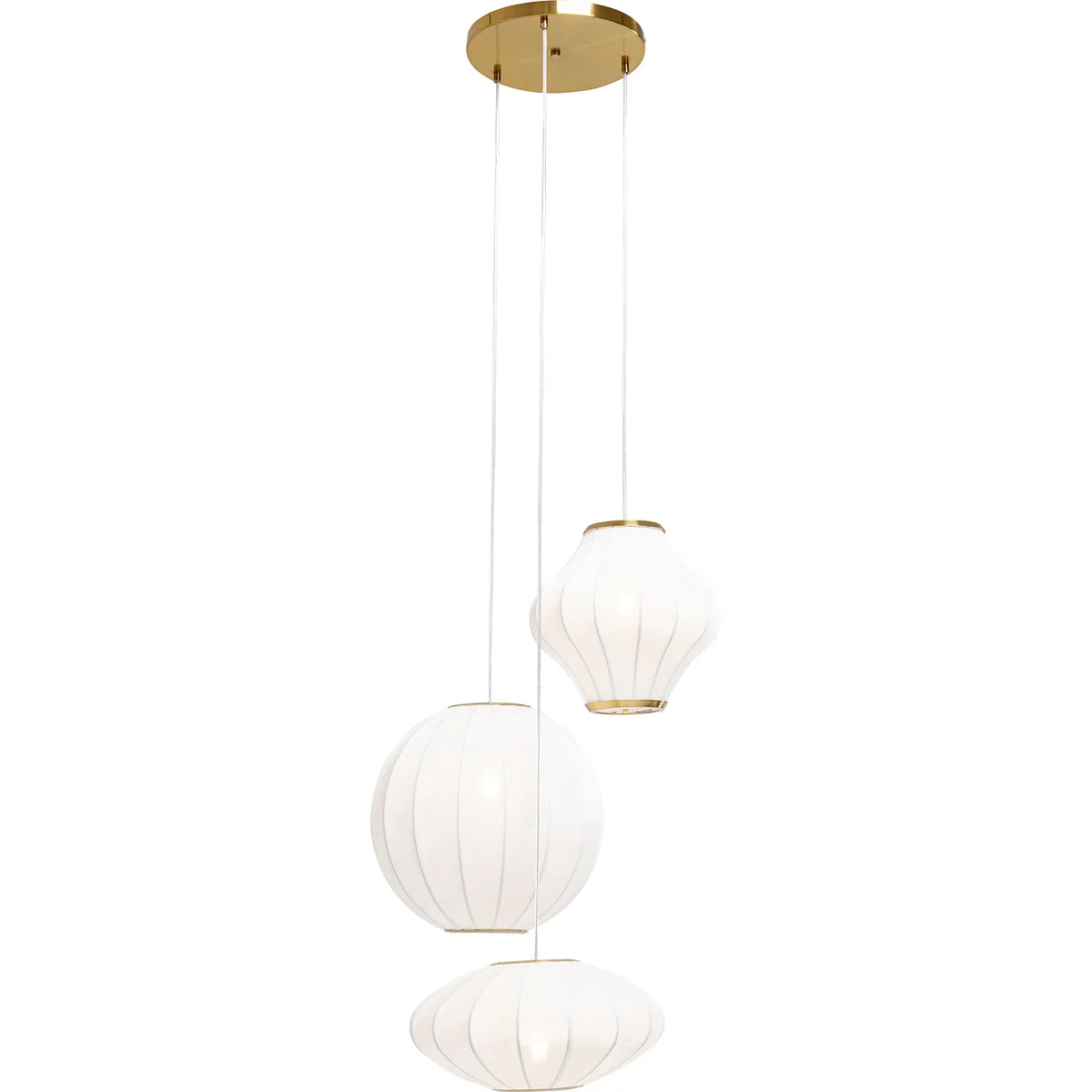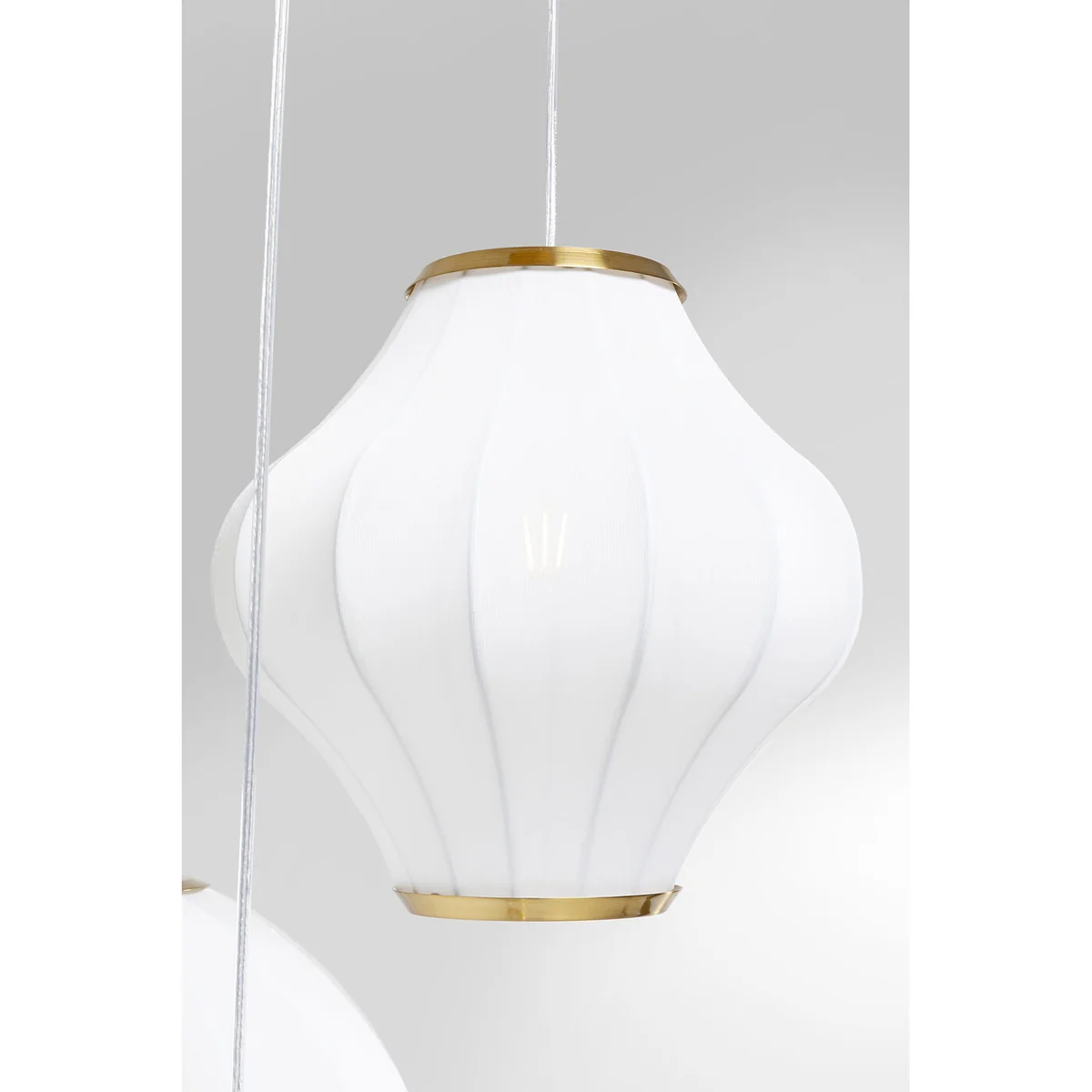 - Height-adjustable: the dreamy pendant lamp with three lampshades is variably adjustable in height from approx. 90 to 250 cm - Gold as a highlight: the canopy and decorative elements on the lampshades are made of brass-coated steel - Versatile: as a pendant lamp in the bedroom or a romantic eye-catcher above the dining table - White pendant lamp: with these white textile lampshades the Japandi style succeeds with ease - LED lamp: requires 3 LED bulbs with 230 V, 50/60 Hz, E27 socket and max. 40 Watt, bulbs not included