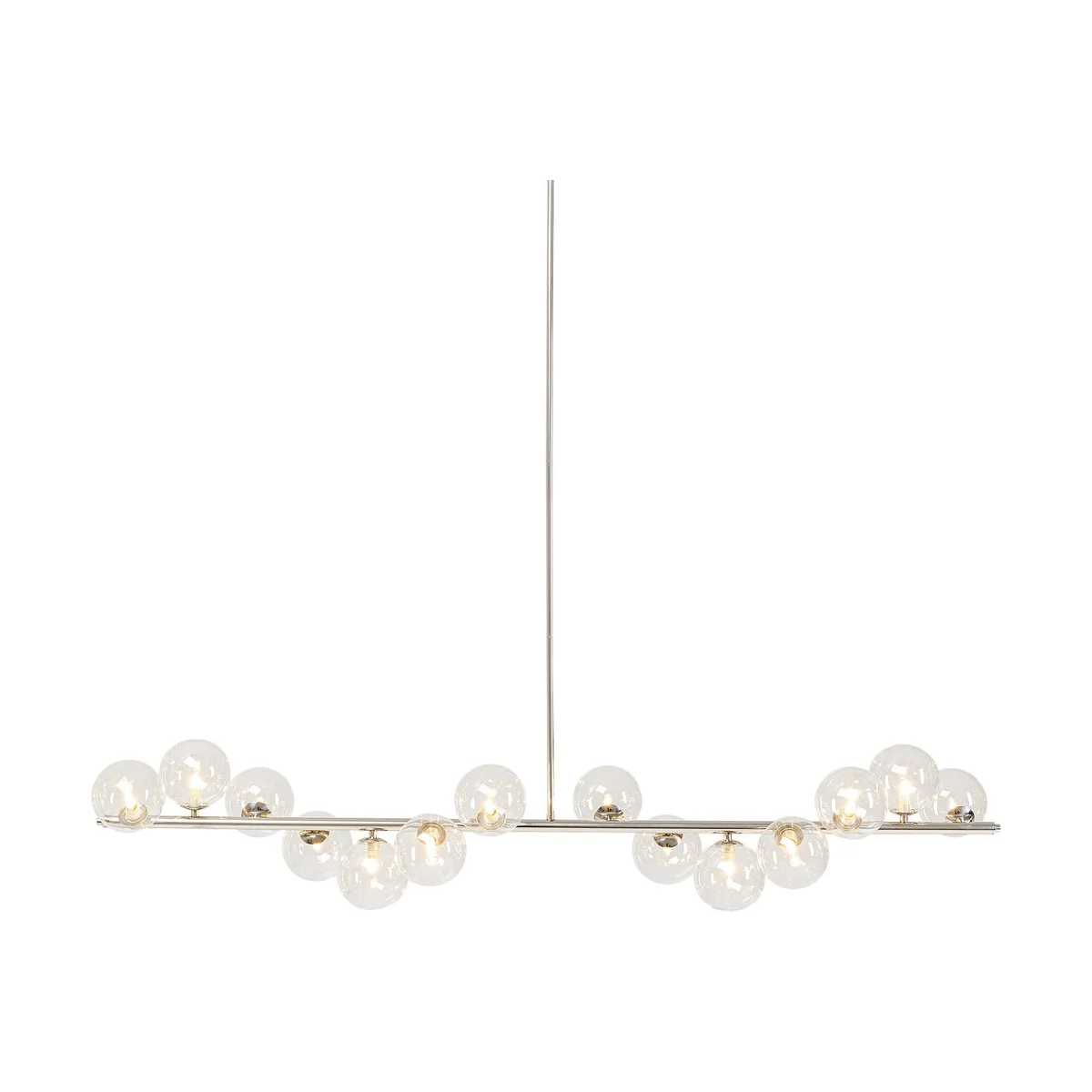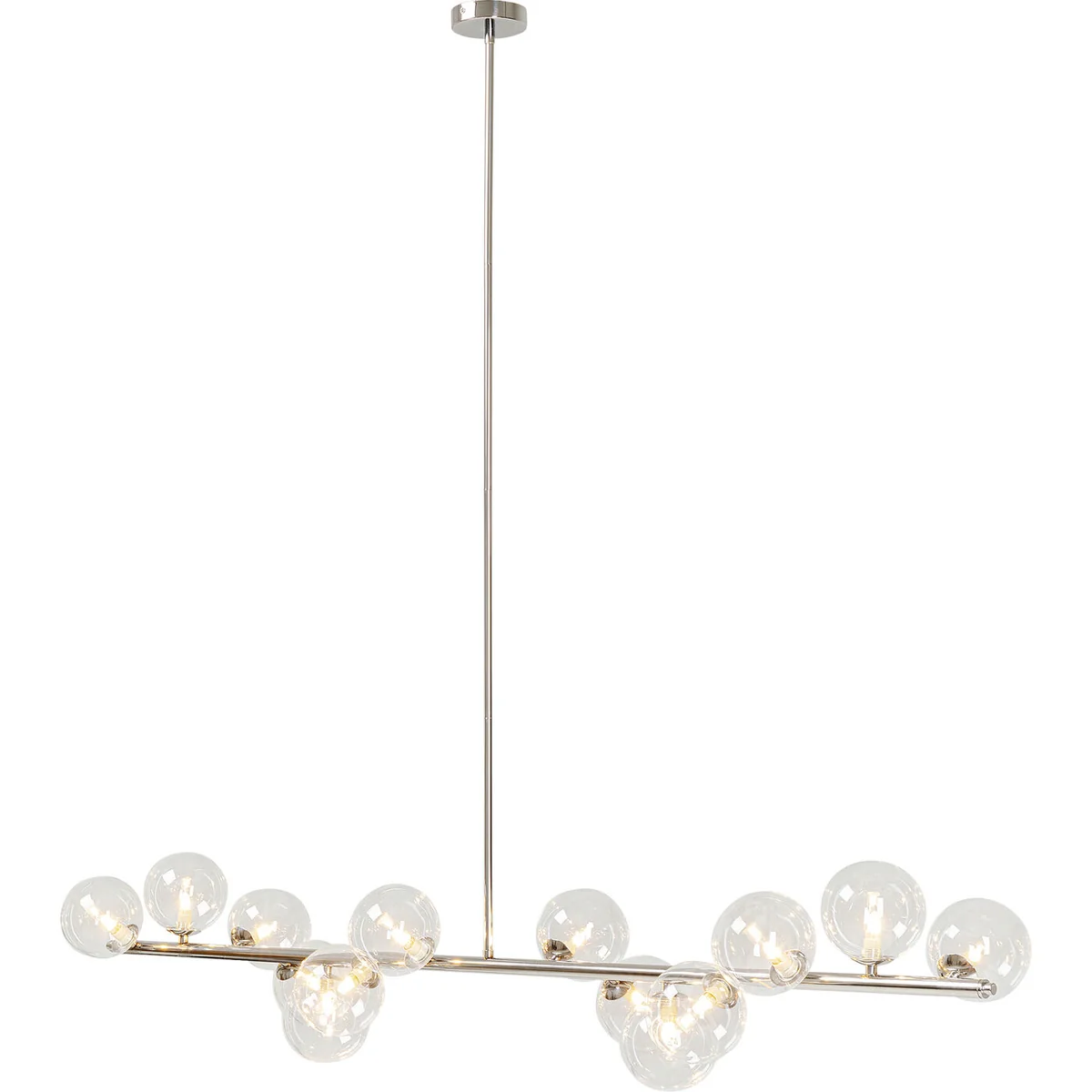 The lamp measures 155cm in length, 28cm in diameter, and 138cm in height. It features a unique design with cascading glass balls in a chrome finish, offering a modern touch to any room. The silver glass plated shade adds an extra layer of sophistication.