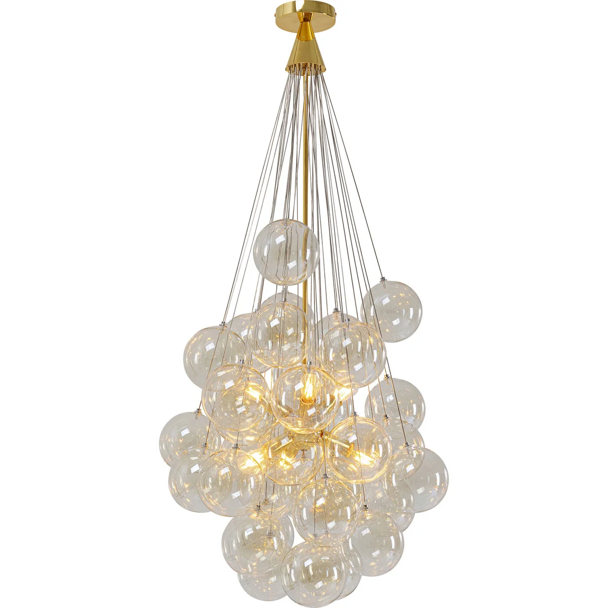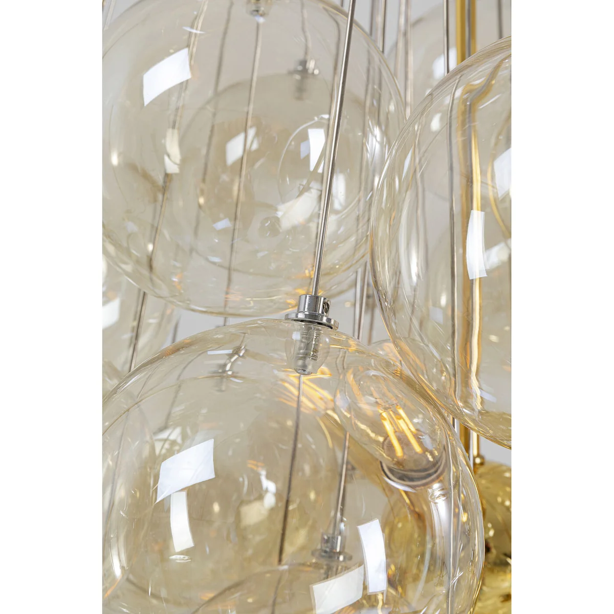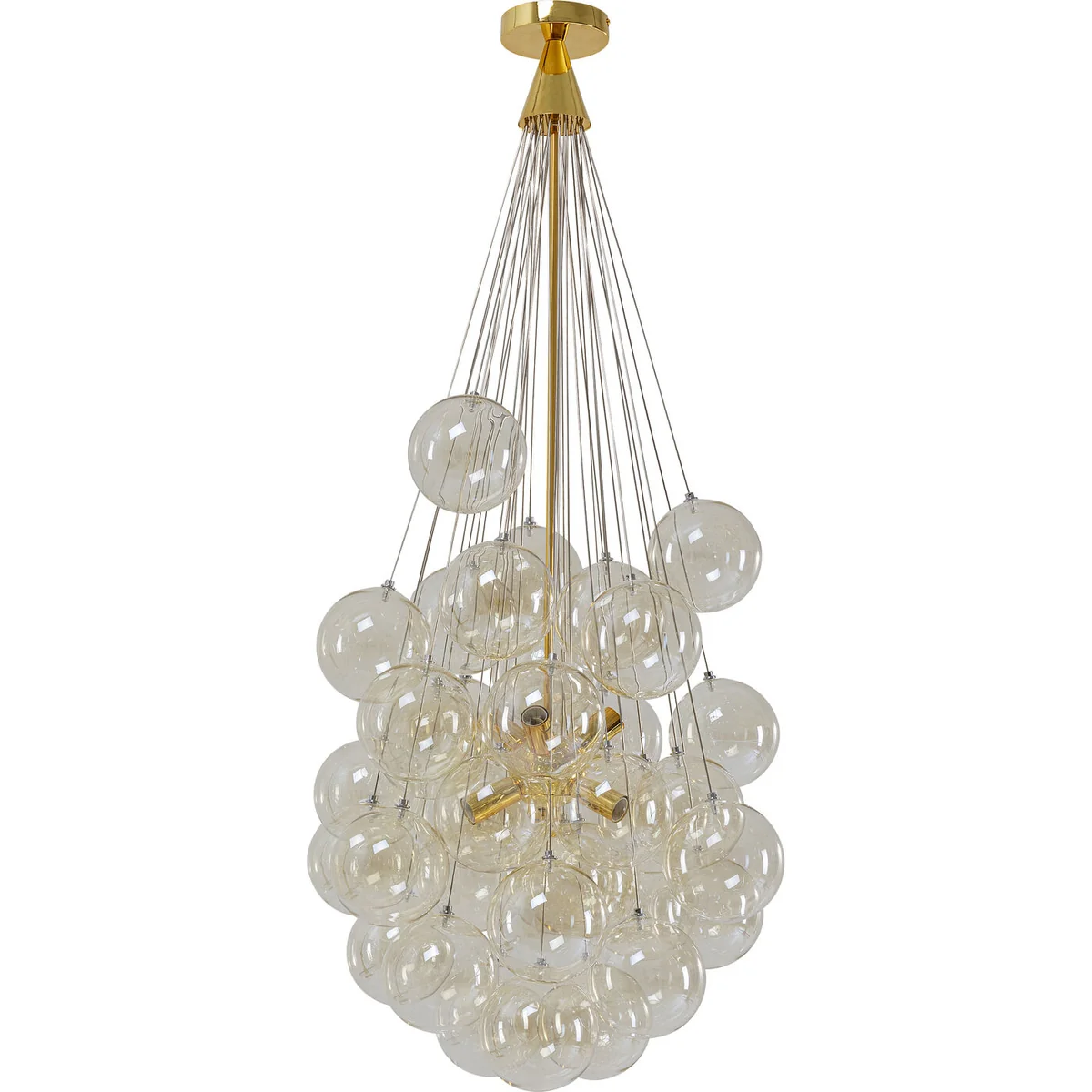 - Golden pendant lamp made of chrome-plated metal and coloured glass, 6 bulbs, 117 x 50 x 50 cm (H/W/D) - What makes this lamp unique is the cluster of shimmering glass spheres that act as a creative lampshade around the light sources - The design and the high-quality materials make this ceiling lamp a decorative lighting object with display character - The transparent glass globes are tinted a delicate beige - 230 V, 50/60 Hz, socket E14, number of light sources 6, max. 40 W, bulbs not included