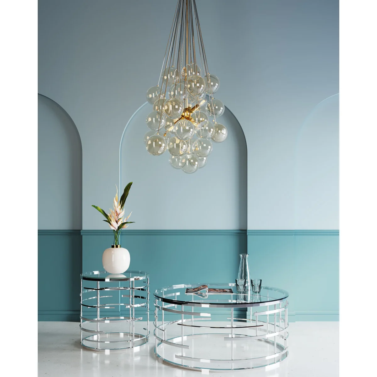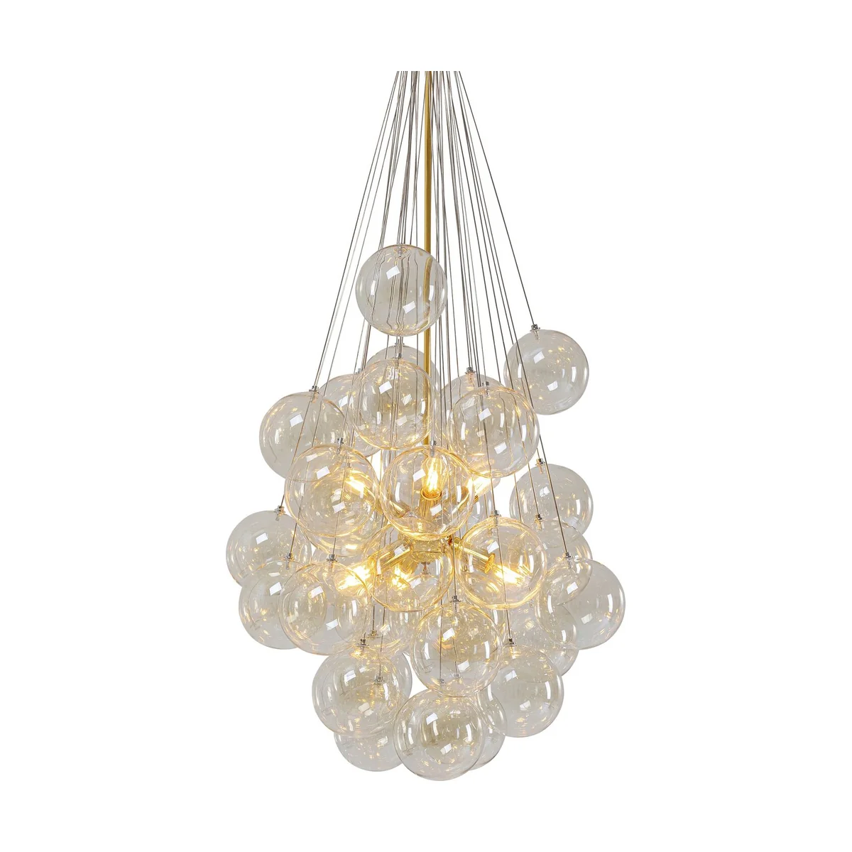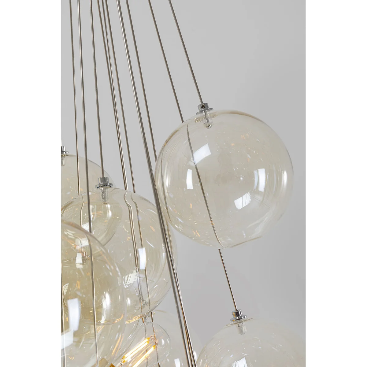 - Golden pendant lamp made of chrome-plated metal and coloured glass, 6 bulbs, 117 x 50 x 50 cm (H/W/D) - What makes this lamp unique is the cluster of shimmering glass spheres that act as a creative lampshade around the light sources - The design and the high-quality materials make this ceiling lamp a decorative lighting object with display character - The transparent glass globes are tinted a delicate beige - 230 V, 50/60 Hz, socket E14, number of light sources 6, max. 40 W, bulbs not included