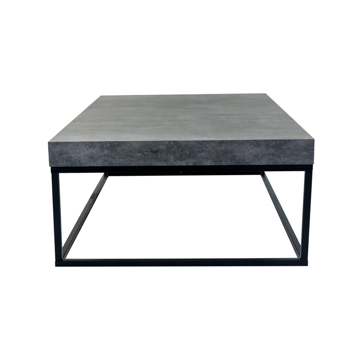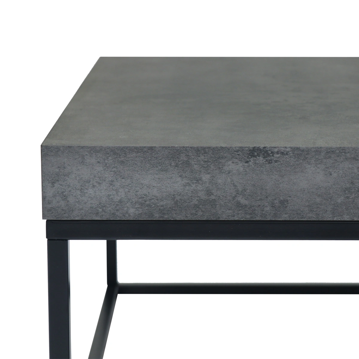 Key features of this table include a 120cm length, 75cm width, and 38cm height, providing ample space for your coffee mugs, books, and decor items. The table is made of robust chipboard with a melamine finish that mimics a concrete look, adding a touch of industrial design to your home. The steel legs lacquered in pure black provide a stable and strong base.