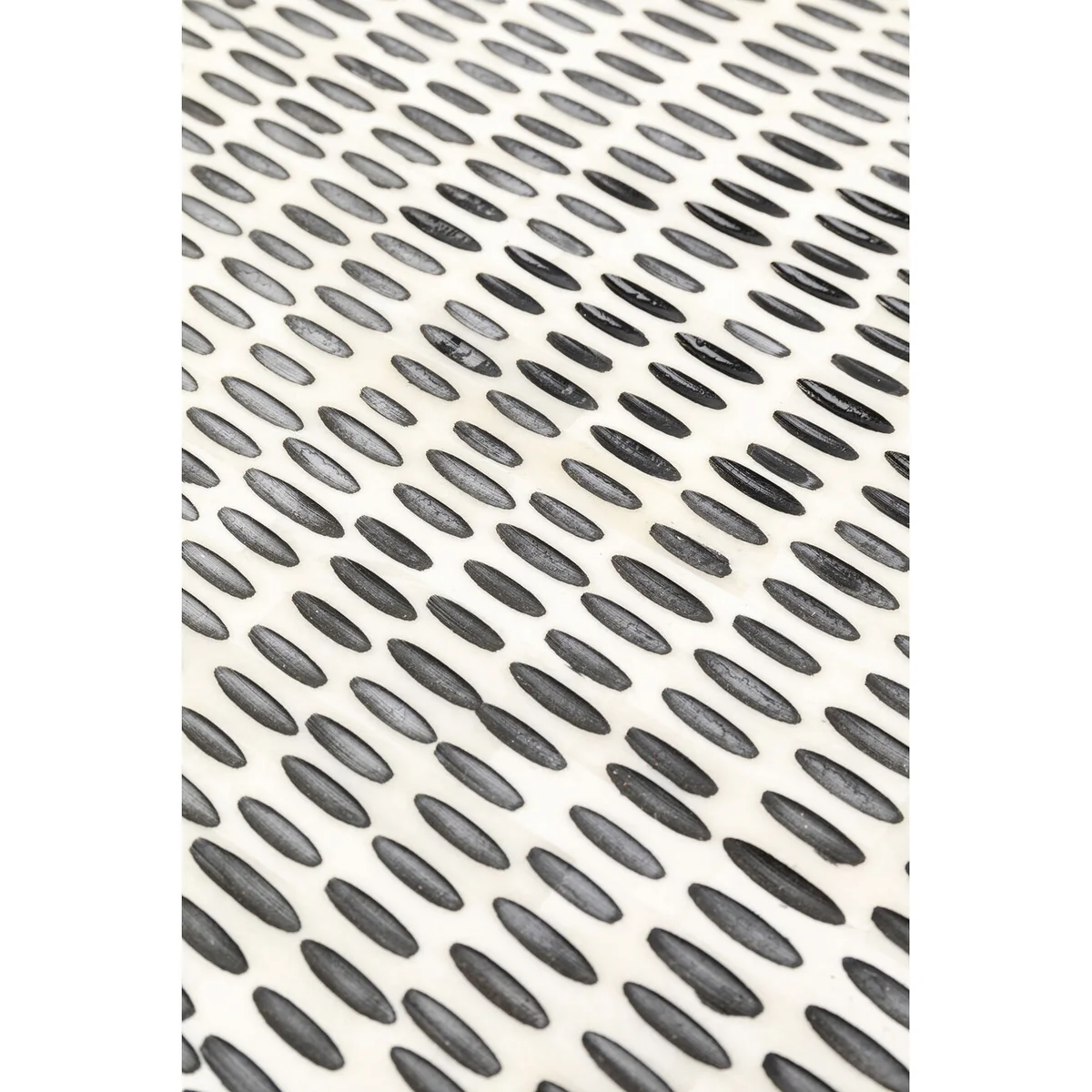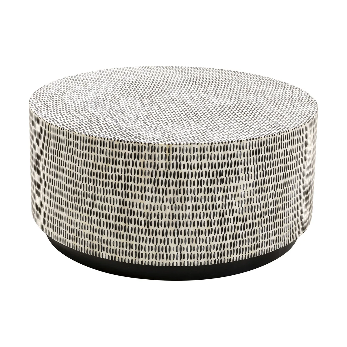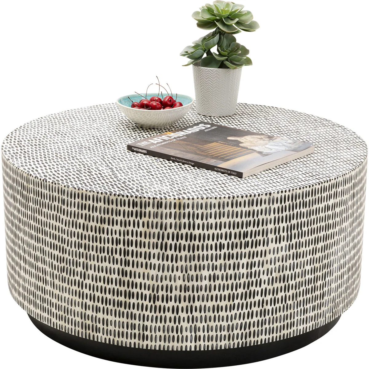 Its round table top, spanning 76cm in diameter and 37cm in height, showcases intricate inlays in contrasting black and white patterns, making each piece unique. The table is constructed from untreated medium density fibreboard (MDF) with polyresin intarsia. It offers a generous surface space for displaying decor, holding coffee cups or storing your favorite books. The slim, dark base adds to the table's floating lightness, enhancing its expressive design.