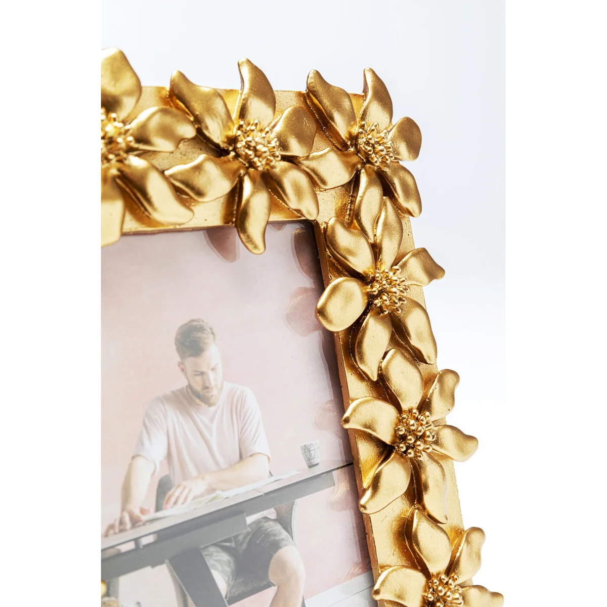 The beauty of the frame with the golden accents makes it unique. The profusion of florals is an interesting change from regular frames.