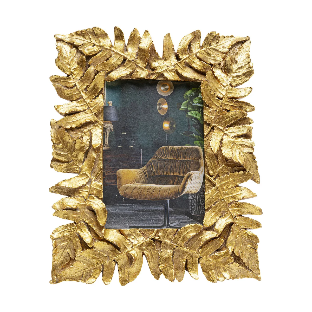 Surrounded by leaves, this golden frame for pictures puts every photo in the best light and pretties up your living room. The leaves are handcrafted and make this home accessory an attractive one-of-a-kind piece. In the living room on the shelf, the console table or in the hallway and bedroom on the sideboard - this picture frame with the dimensions 23.5x19.5cm ( H/W) will give your favourite pictures the attention they deserve!