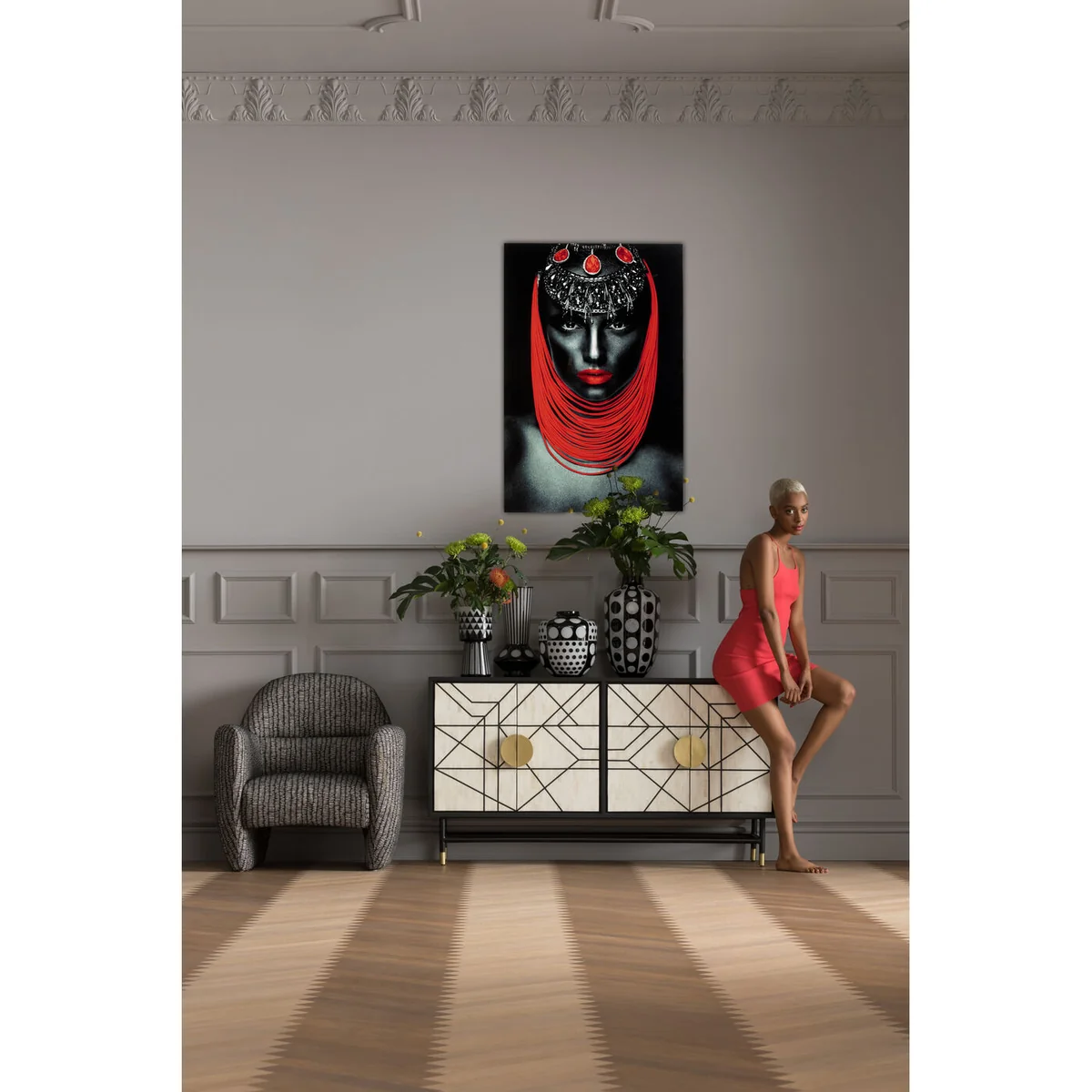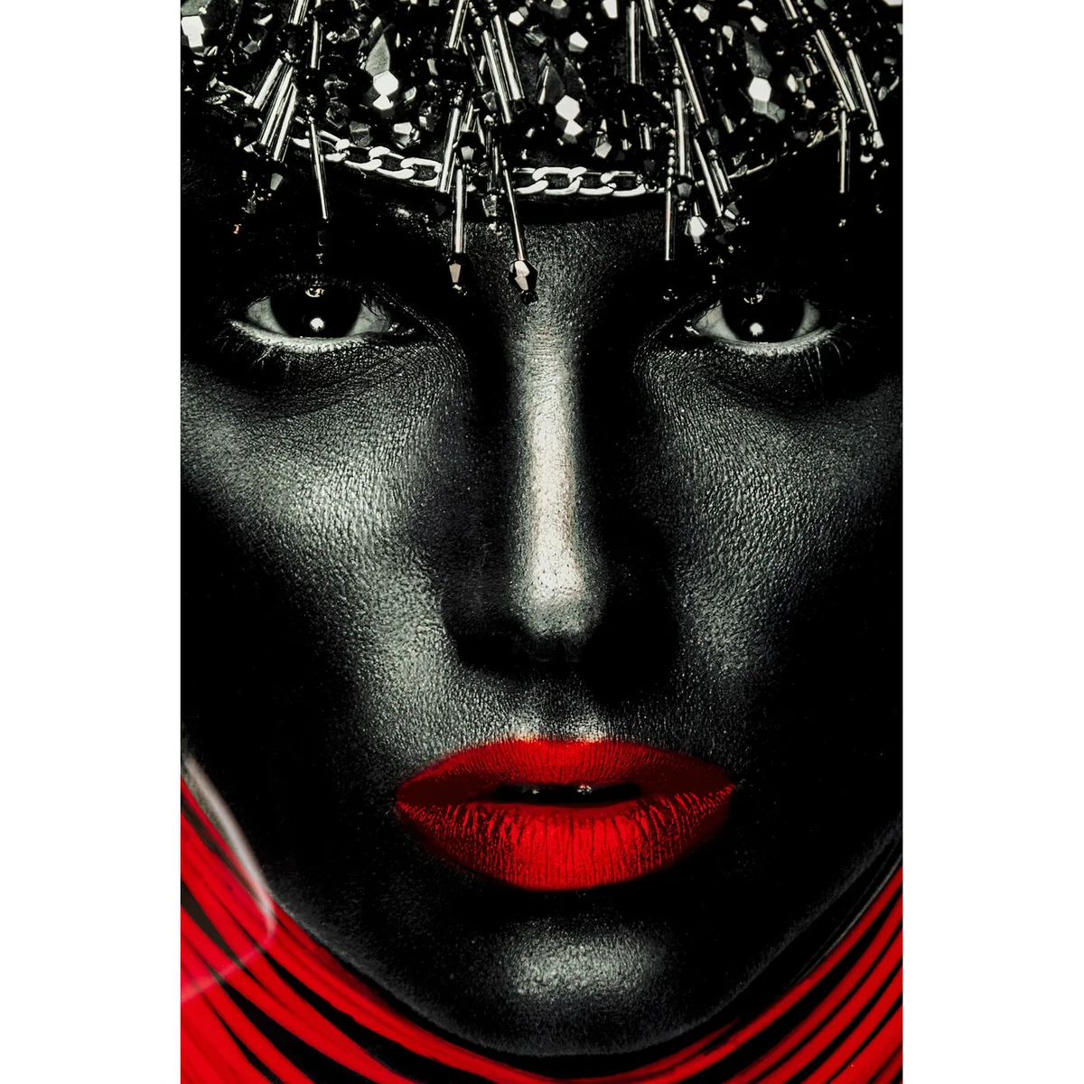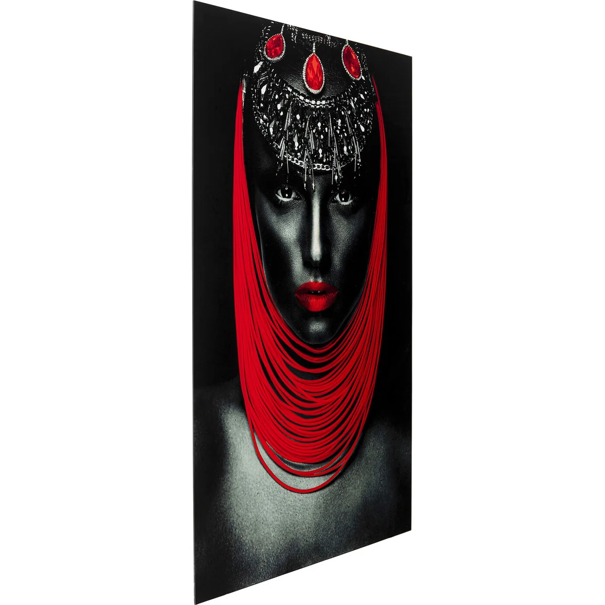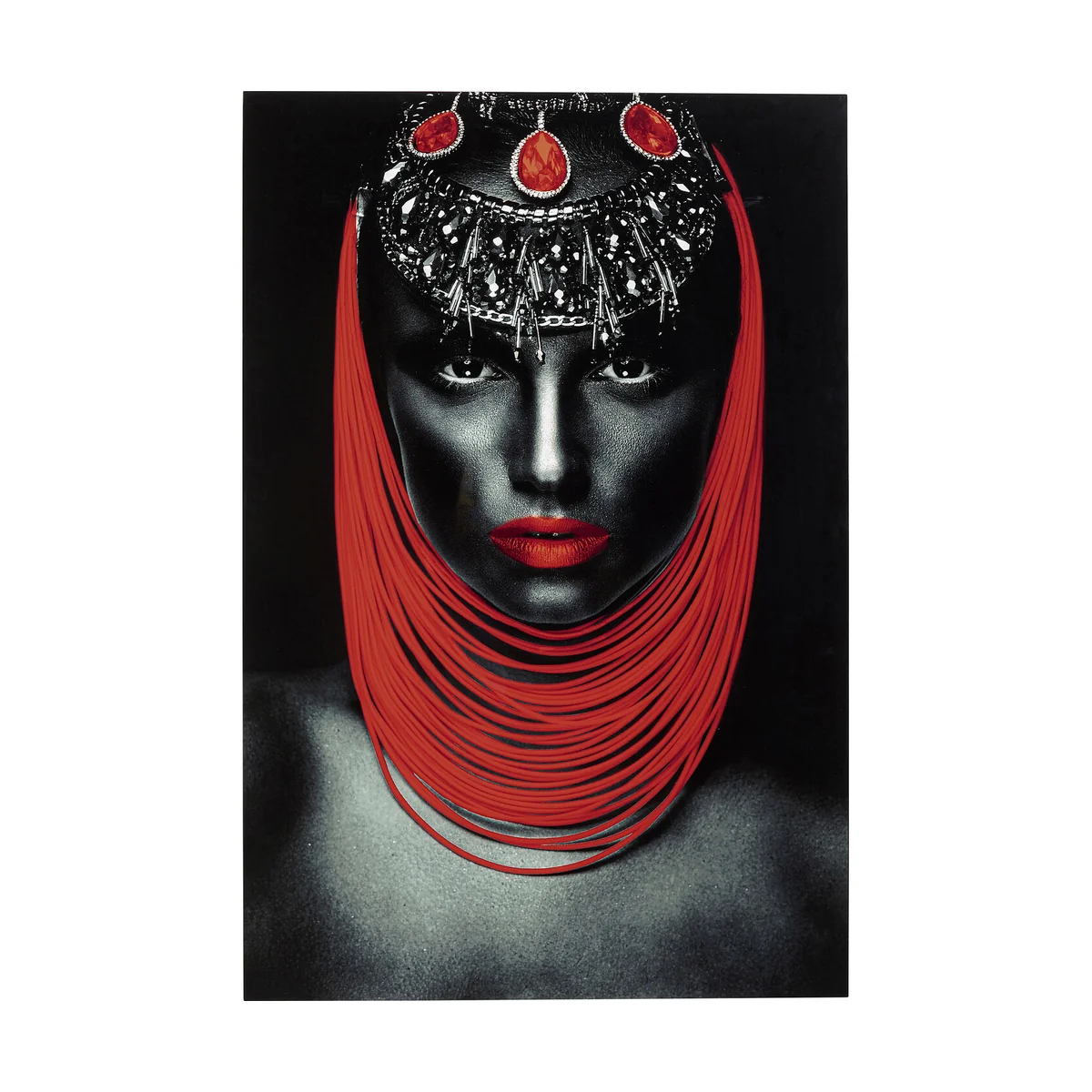 - Large, portrait format glass picture in black, white and grey with a pinch of fire red - Photographic art for wall decoration with the portrait of an exceptionally beautiful person and spectacular jewellery - The artistic portrait suits the neutral living style just as well as rooms with a loft character - Frameless pictures such as this one always make a pure and modern impression - The picture with its digitally processed photography is an effective and creative break with classic interiors