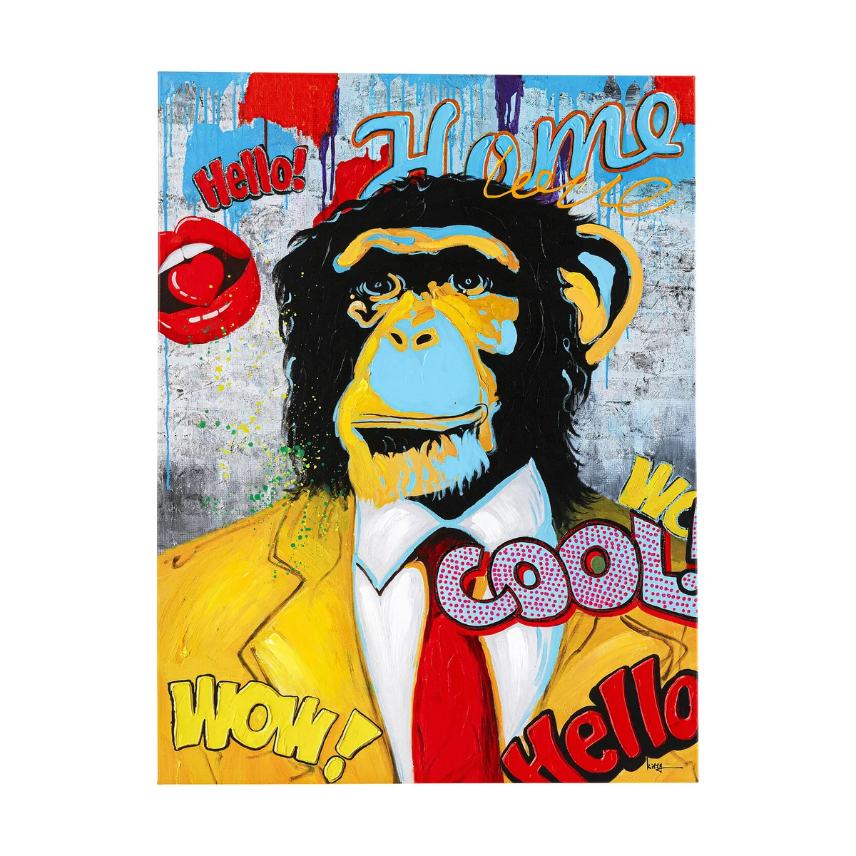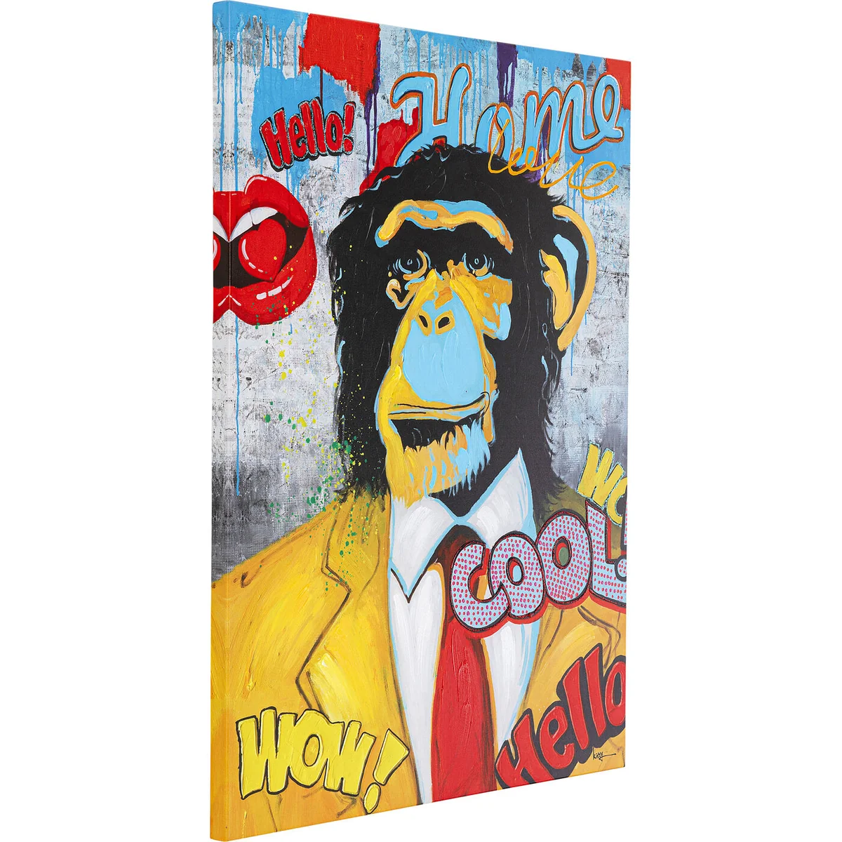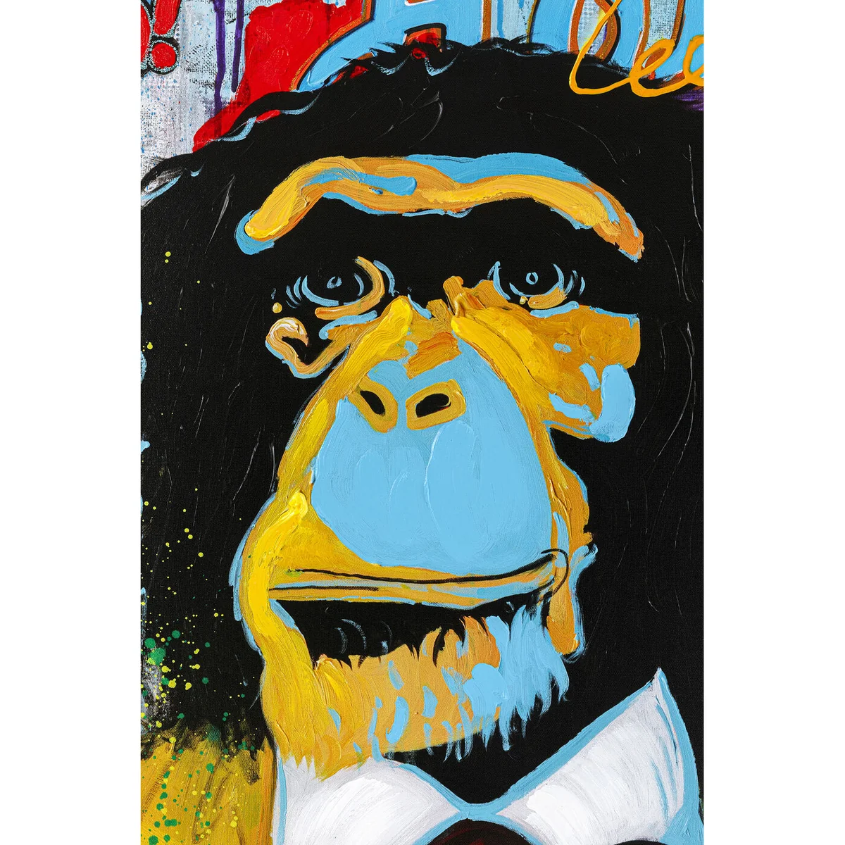 - Large, portrait-format picture in the colourful Pop Art style with a witty monkey motif - Printed on canvas and with hand-painted details in acrylic paint - as a result each poster picture is unique - Proof that colour on the wall and humour in the home add something to the atmosphere - Exceptional wall decoration with eye-catching quality, because this primate has dressed up for his job - A generous gift idea for all who love comics
