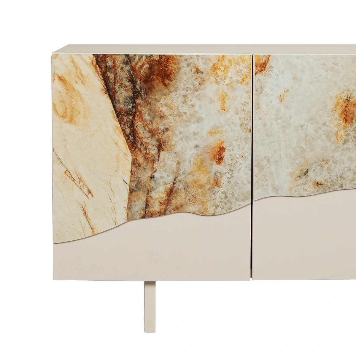 The Pisa Beige Sideboard offers both storage and style with its sleek lacquered ennobled structure and ceramic door details. Its spacious compartments provide ample storage for tableware, linens, and dining essentials. The neutral beige finish makes it easy to pair with a variety of dining room styles, adding a refined yet practical element to your home. Care instructions: Clean the ceramic panels with a damp cloth. For lacquered surfaces, use a soft cloth and neutral soap if needed. Do not use harsh or abrasive cleaners.