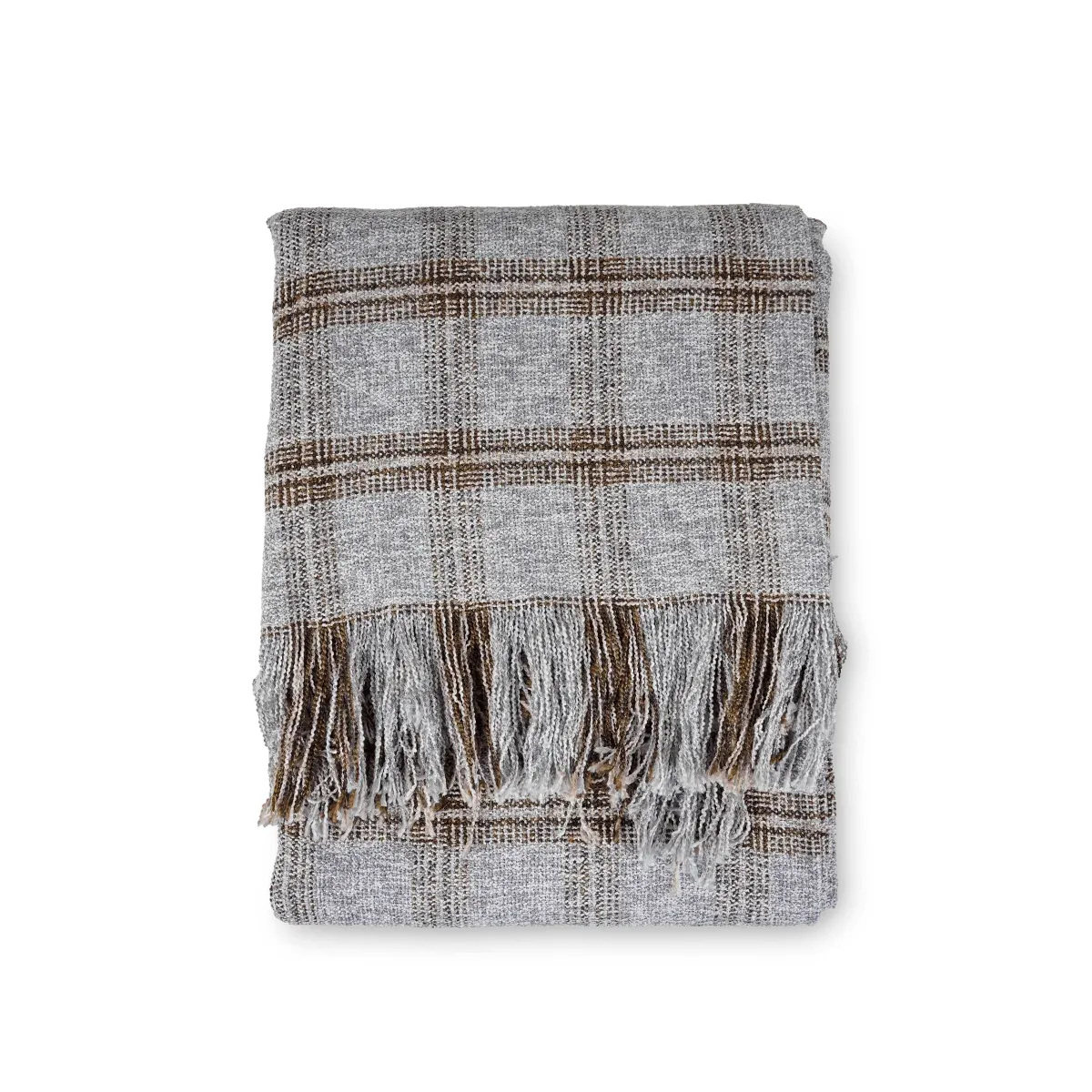 Introducing the Grey/Brown Plaid Viscose Polyester Cotton Throw Blanket, a perfect blend of comfort, style, and warmth for your living space.