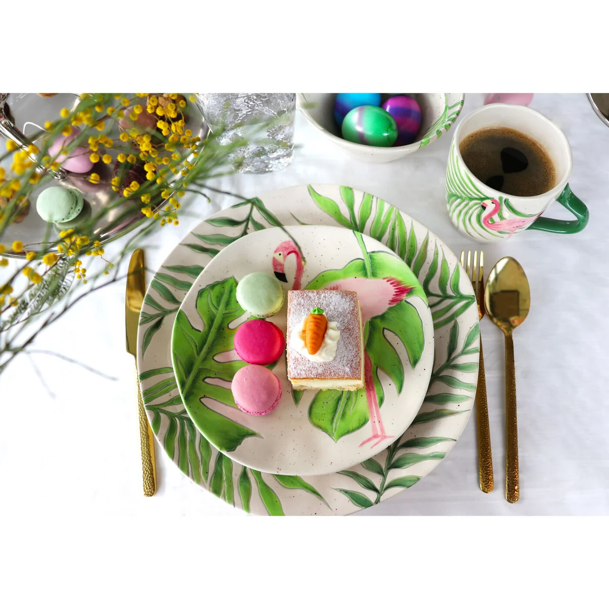 Decoration fans love the Miami style and the jungle look. This range of tableware has everything that makes for exotic flair: tropical leaves against a sand-coloured background and gorgeous pink flamingos. Handcrafted from earthenware, this ceramic tableware brings Caribbean ease to the kitchen, dining room and office.