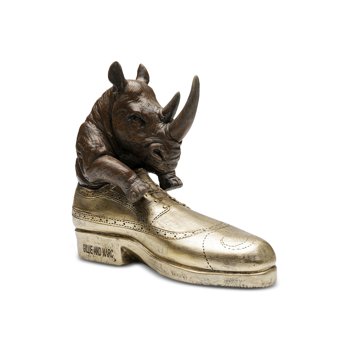 This original decorative object is a real eye-catcher: a gold-coloured lace-up shoe with a rhino sitting in it. Perfect for anyone who wants to add a playful, stylish touch to their home. Ideal for fashion and animal lovers looking for unique highlights. Not only a conversation starter but also an extraordinary feature in any interior.