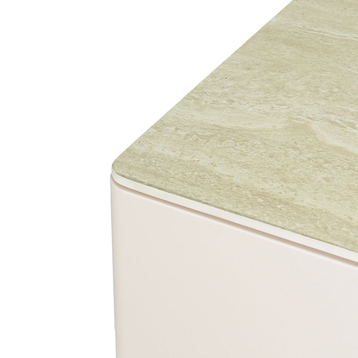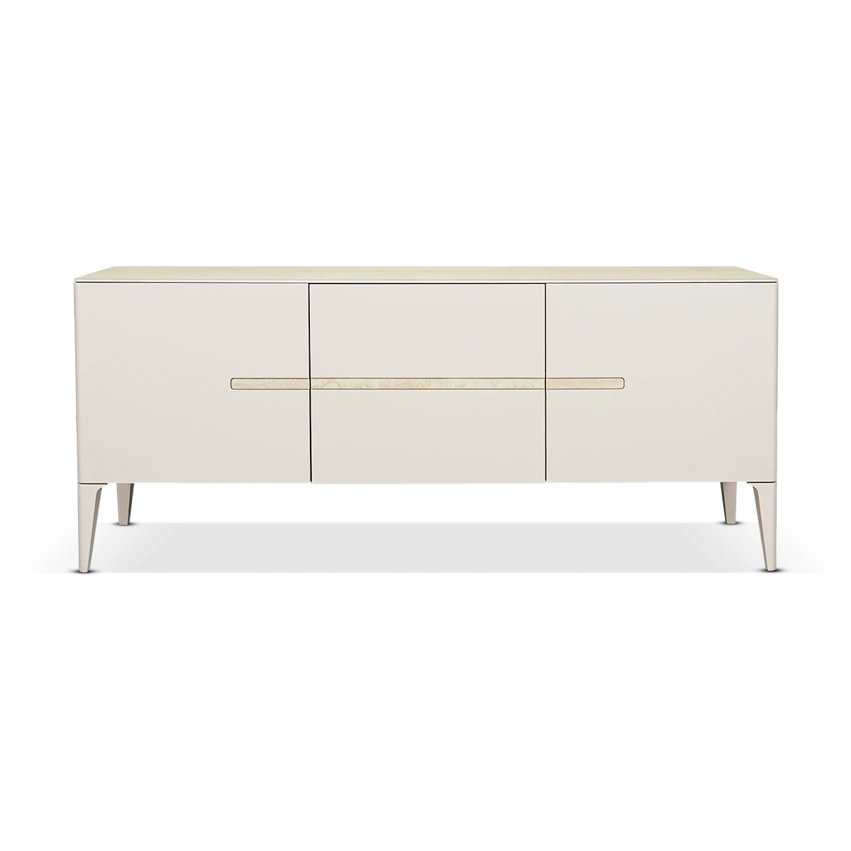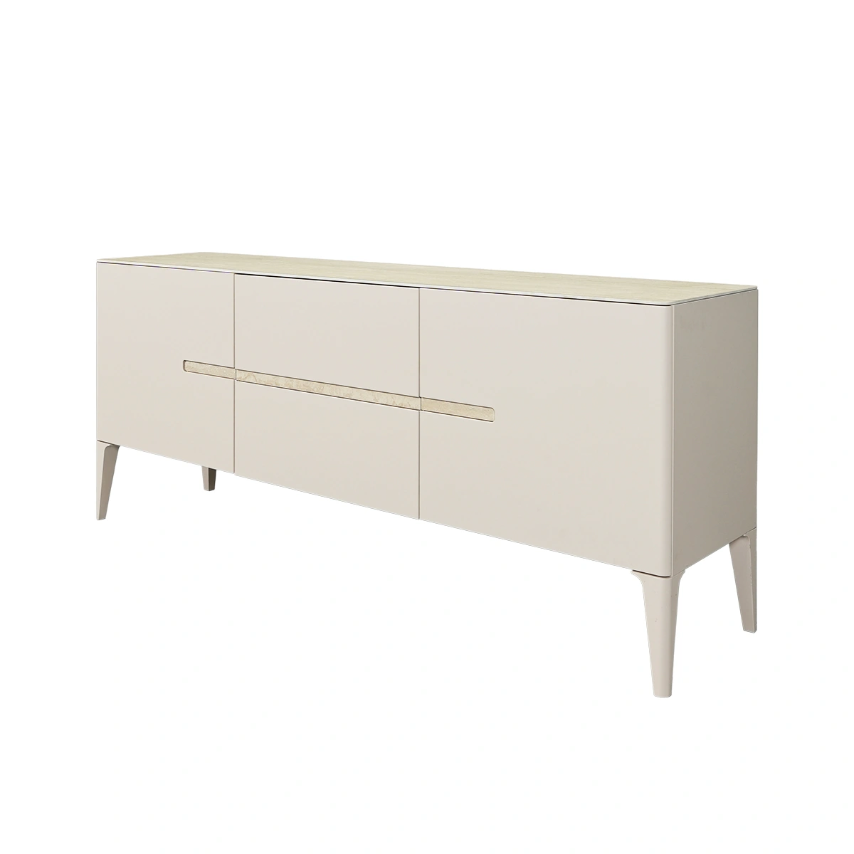 The Pompeii Travertine Sideboard combines timeless design with practical storage. Its lacquered MDF structure is topped with a ceramic surface that mimics the look of travertine. The solid beech feet provide a stable base, while the ceramic handles add a refined detail. Perfect for storing dining essentials and displaying decorative items. Care instructions: Use a damp cloth for the ceramic. Clean the wood and MDF with a soft cloth and mild soap. Avoid aggressive cleaning agents.
