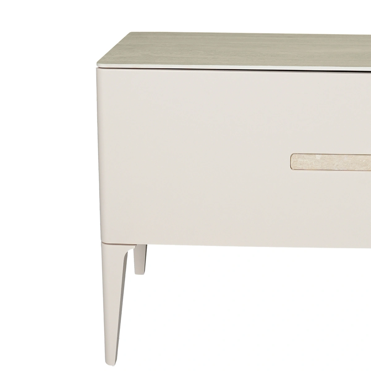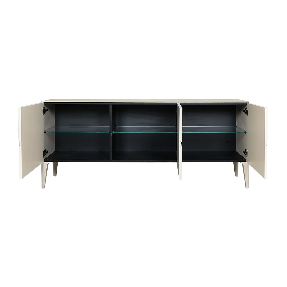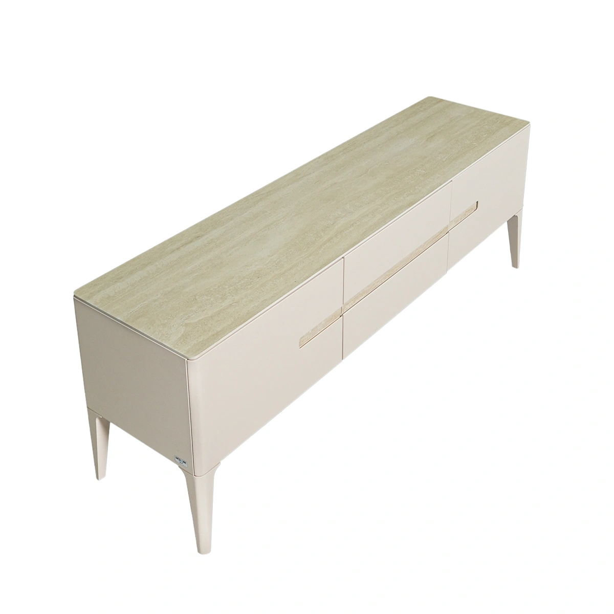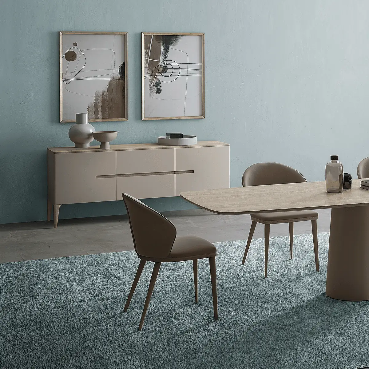 The Pompeii Travertine Sideboard combines timeless design with practical storage. Its lacquered MDF structure is topped with a ceramic surface that mimics the look of travertine. The solid beech feet provide a stable base, while the ceramic handles add a refined detail. Perfect for storing dining essentials and displaying decorative items. Care instructions: Use a damp cloth for the ceramic. Clean the wood and MDF with a soft cloth and mild soap. Avoid aggressive cleaning agents.