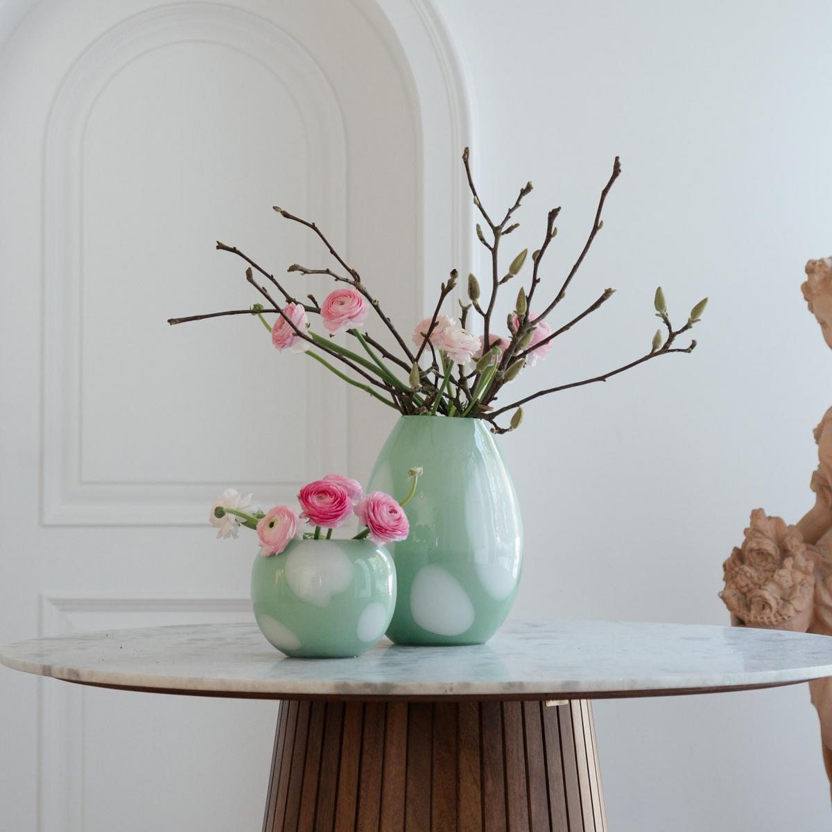 • In a refreshing pastel green with white accents and thanks to its rounded shape, the vase sets stylish accents