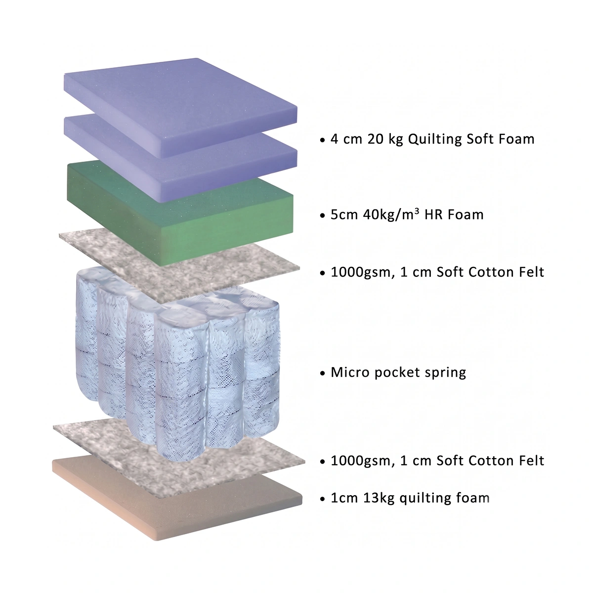 Core: 1.8 mm Micro Pocket Spring System; Layer: Soft Cotton Felt Padding; Support: HR Foam Layer