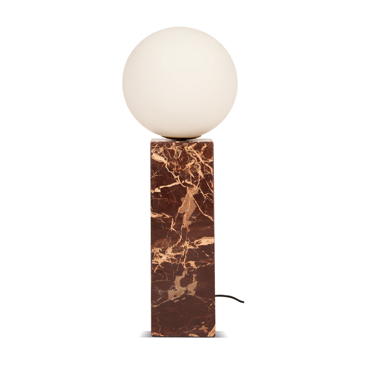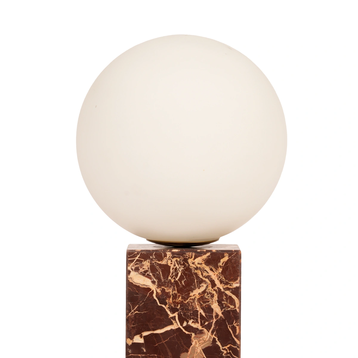 Qube Table Lamp in Cherry introduces rich tones and sculptural form. The marble base and frosted globe merge artistry and warmth, perfect for bedrooms or sophisticated living spaces.