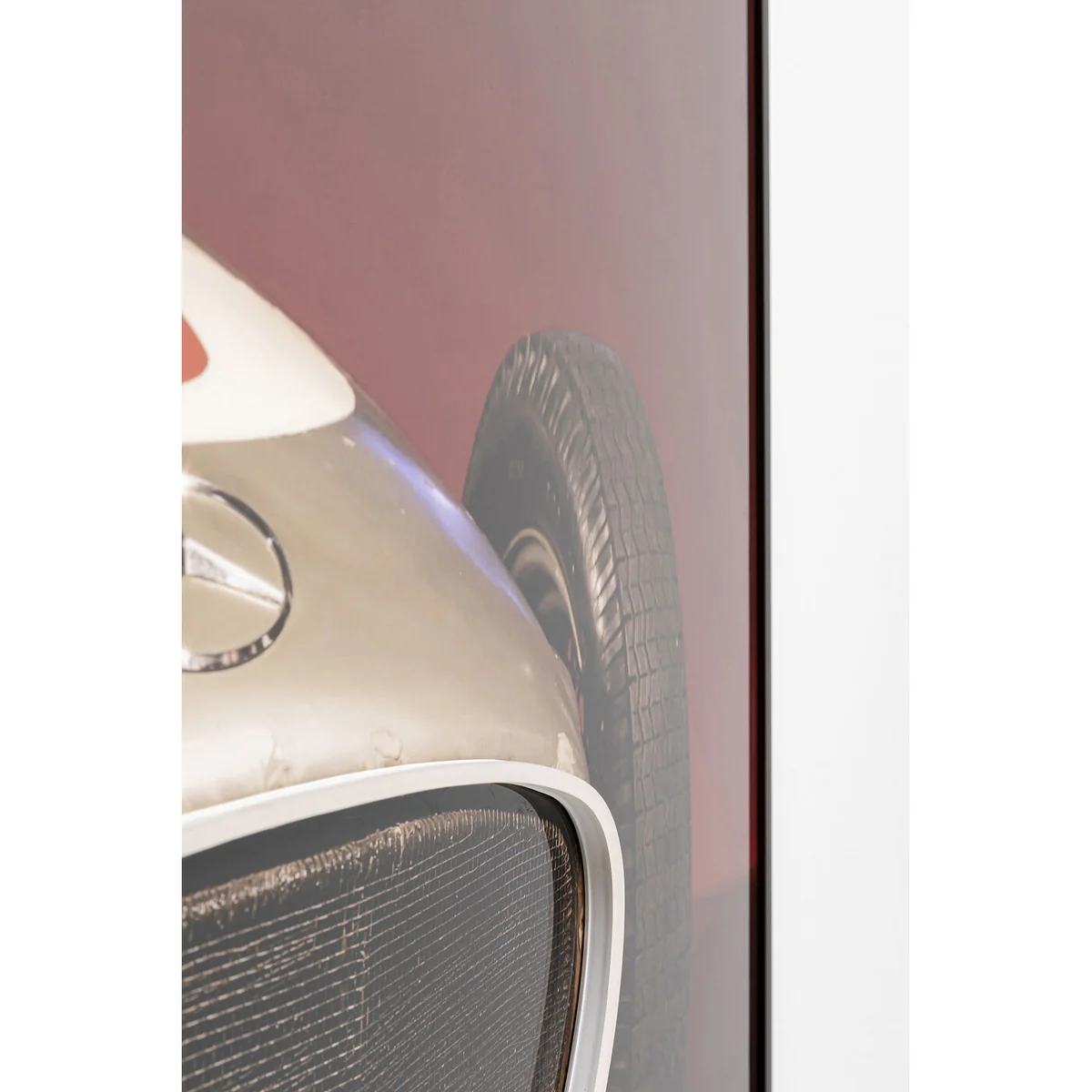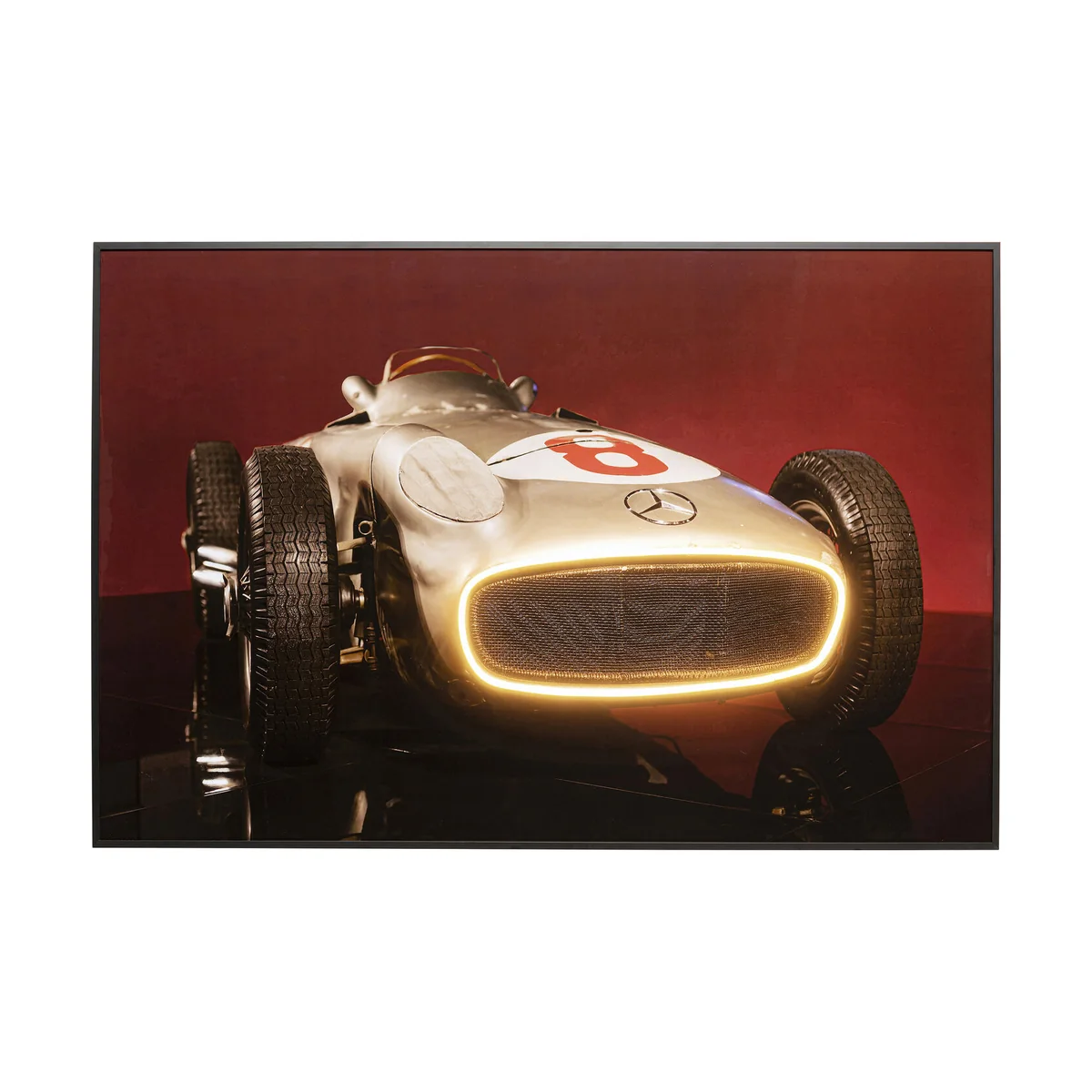 • Large wall mural in red with car motif and LED effect, 80 x 120 x 3.5 centimetres (H/W/D) • The silver vintage-style racing car stands out perfectly against the dynamic background in rich red • The simple black frame and extraordinary LED effects in warm white make the wall glow • Picture hooks are already mounted on the back for easy wall mounting • 230 V, light source type LED, number of light sources 1, max. 4.8 watts, light source included, light source not replaceable