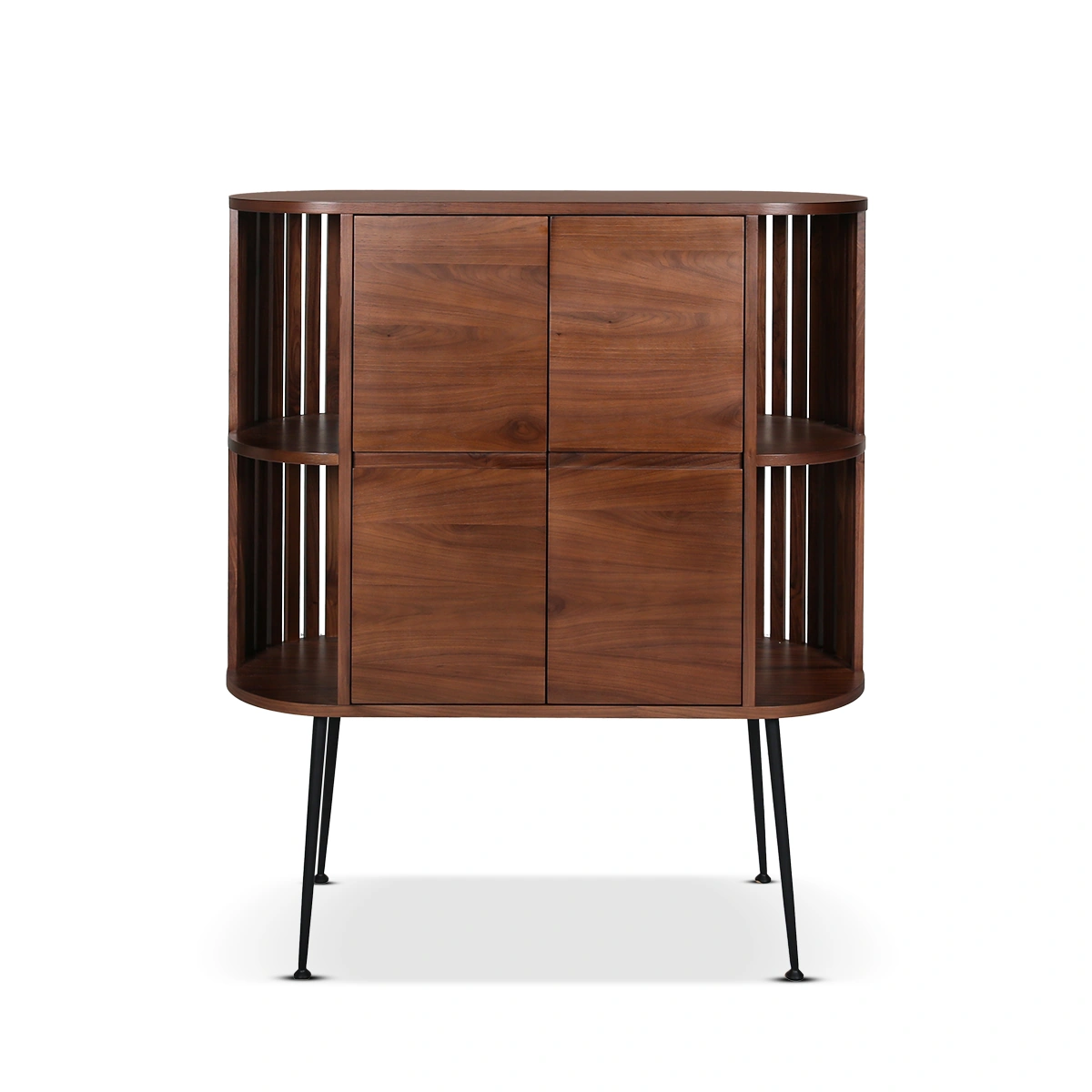 Enhance your entertaining space with this sophisticated Recap Bar Cabinet in Walnut Veneer. Its sleek design and black metal legs lend a contemporary touch to your decor.