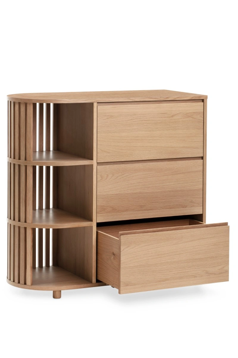 The Recap Dresser, made from solid oak veneer, offers natural elegance with a modern twist. Its three spacious drawers and oak finish are perfect for those who appreciate minimalist design with a warm, organic feel.