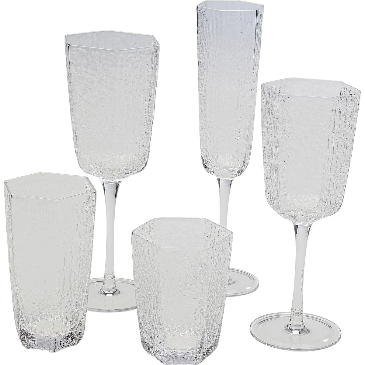 The glasses in the Cascata collection impress with their unusual, hexagonal shapes and textured surface, which gives them a high-quality, natural look. The glasses adapt effortlessly to different table settings - whether on a minimalist breakfast table, as a highlight at festive occasions or in a stylish dinner decoration. They perfectly complement both Scandinavian and contemporary styles and can be beautifully combined with muted colors or bold accents to add a sophisticated yet understated atmosphere to any room.