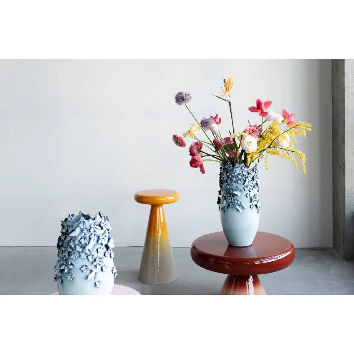 • Slim, round side table in white and yellow, 40 x 42 x 42 centimeters (H/W/D) • Der Beistelltisch begeistert mit seinem sanften Farbverlauf in sonnigen Gelb-Tönen • Cone-shaped base in combination with a wide, organically shaped table top for a harmonious design • Made of enameled steel, the table impresses with its shiny surface and robust finish • Functional next to the sofa and armchair, in the hallway or as a bedside table as a bright splash of color