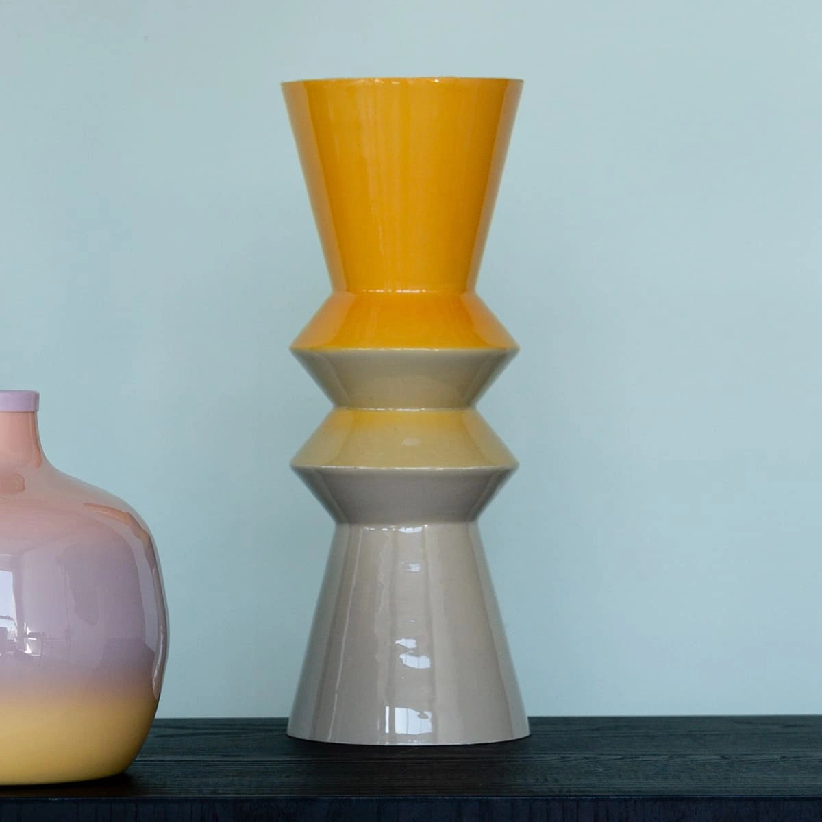 As radiant as the morning sun, this unusual vase adds a bright accent to the living room. The harmonious color scheme in warm yellow gives every flower arrangement a fresh, lively look. Its artistic shape makes it an expressive design statement even without floral decoration. The glossy surface reflects the light and brings modernity to Scandinavian, minimalist or eclectic interiors. Perfect as a stylish highlight on a side table, on a shelf or as the centerpiece of an elegant table setting.