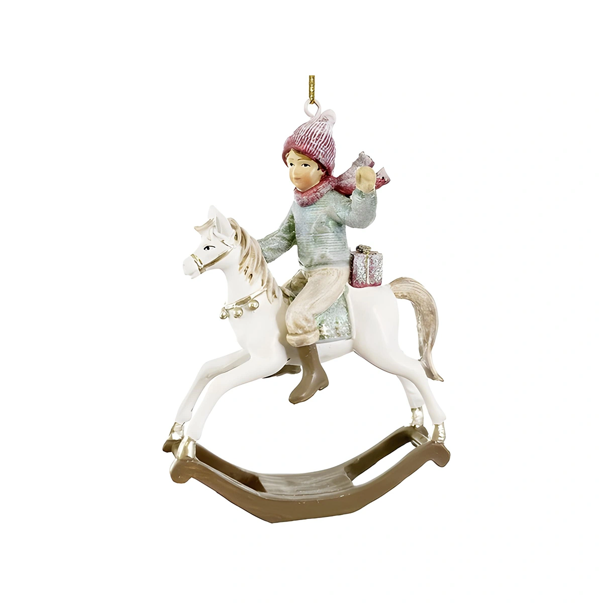 The Rocking Horse Child Ornament in White evokes sweet nostalgia. Its classic design and soft color palette bring a comforting, storybook feel to your holiday decorations.