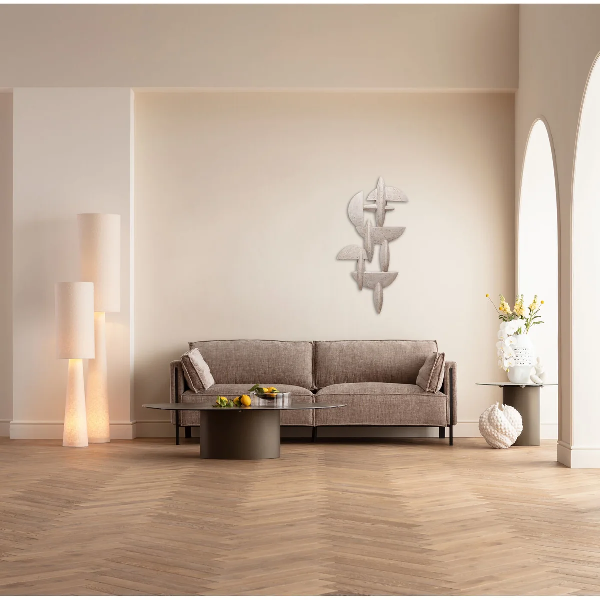 Experience a harmonious blend of modern minimalism and natural elegance with the Extra Large Rotondo Pezzi Wall Object in Beige Polyresin. This stylish piece brings an artistic touch to your living space, boasting an intriguing interplay of light and shadow.