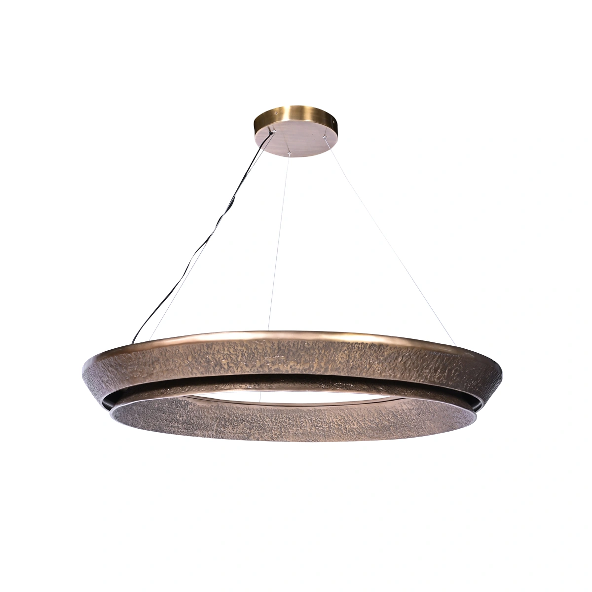 With a diameter and height of L 117.5 cm | W 117.5 cm | H 12.5cm (Total height including wire 126.3cm) respectively, the balanced form of this chandelier, coupled with its soft golden tone and polished brass accent, creates a harmonious blend of beauty and functionality. The frame is made of sturdy aluminium and steel, ensuring durability and longevity.