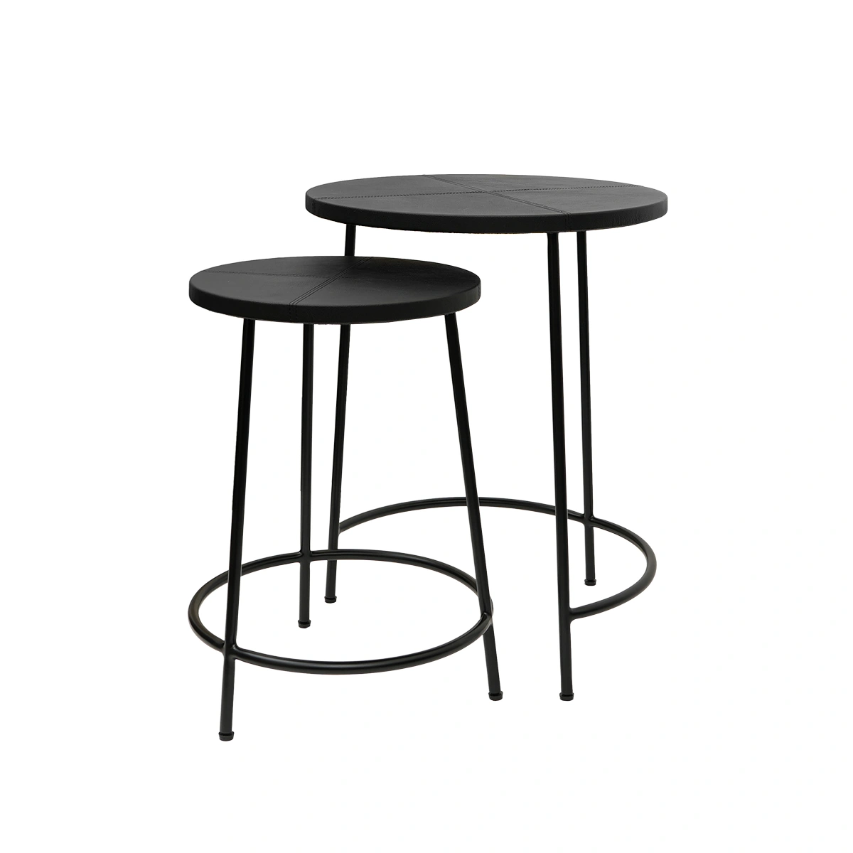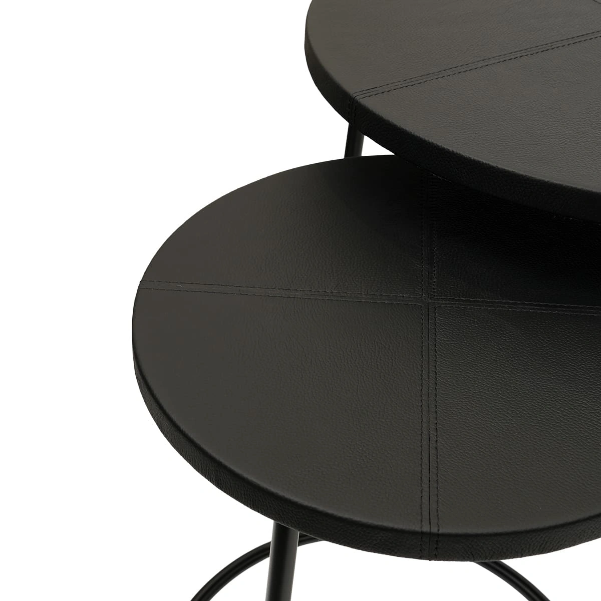 Black Leather Round Nesting Tables, Set of Two, Iron Frame
