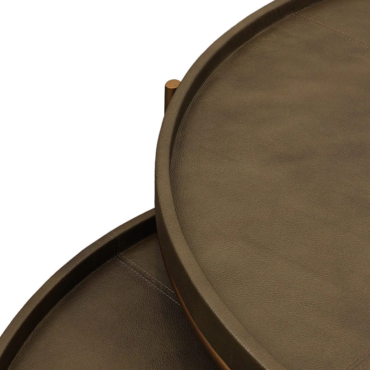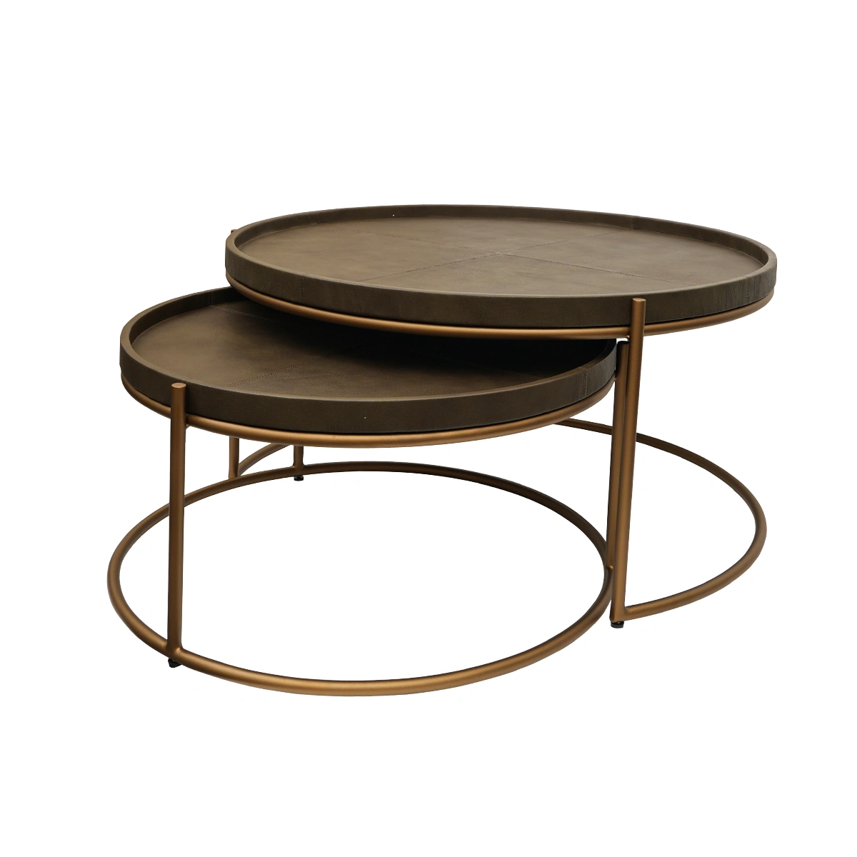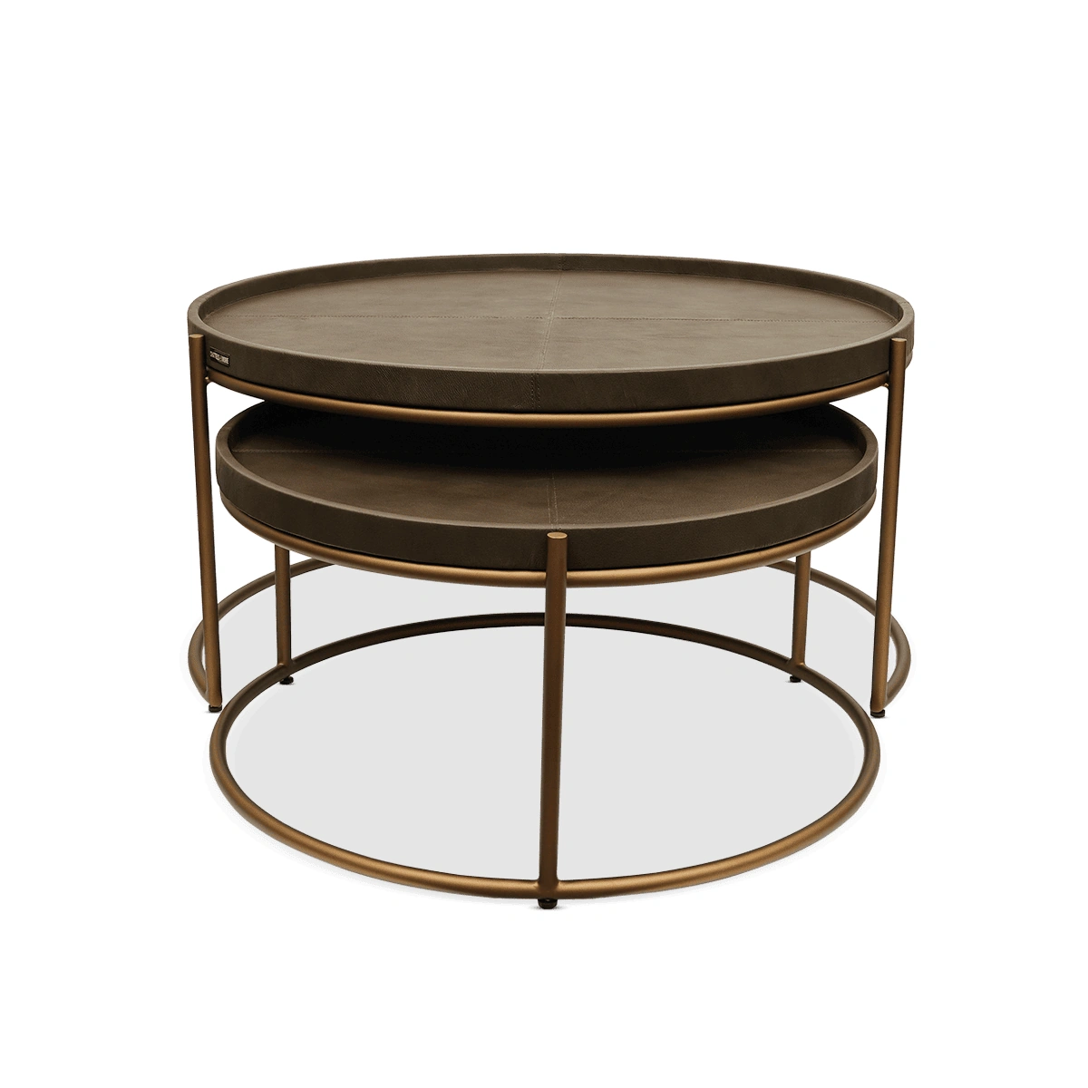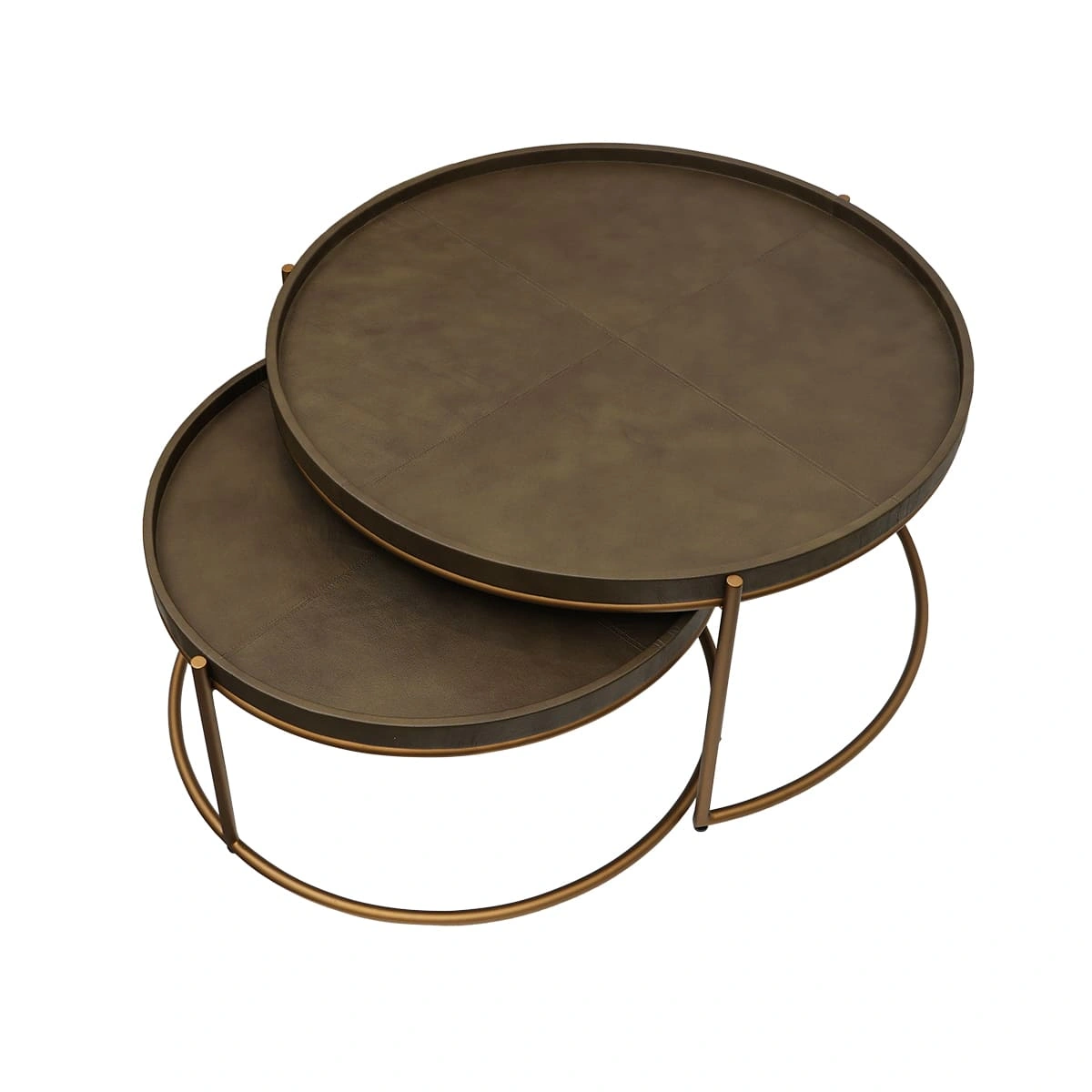 Each table in the set features a soft grey leather top, tastefully balanced by a clean iron frame. The larger table measures 77cm in diameter and 39.5cm in height, while the smaller one is 63cm in diameter and 32cm high. Crafted with top-notch leather and iron, these tables are sturdy, durable, and designed to last.