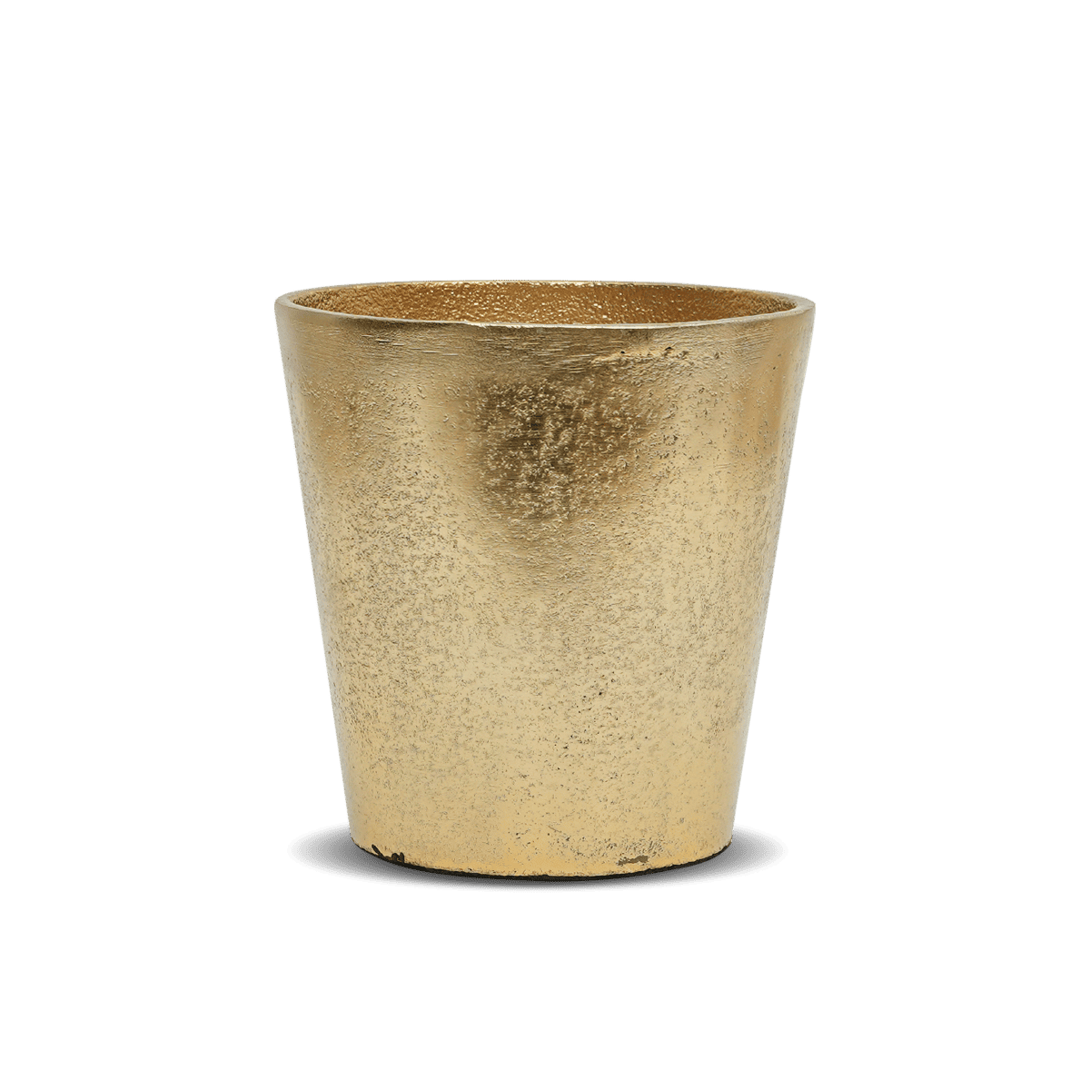 Round Taper Pot Small in Antique Bright Gold adds warmth and radiance. Ideal for small plants or as a chic accent piece, it pairs well with neutral or dark-toned interiors.