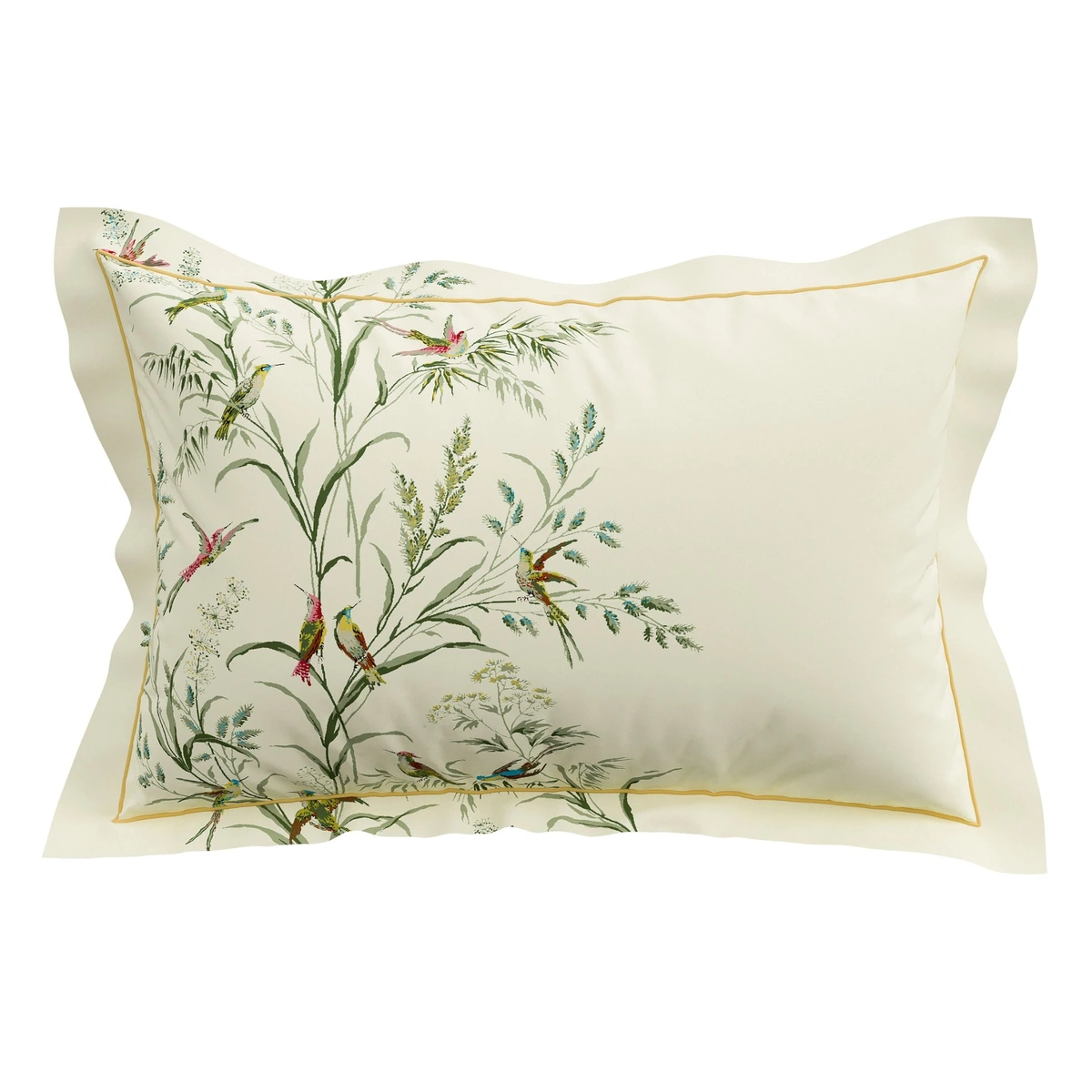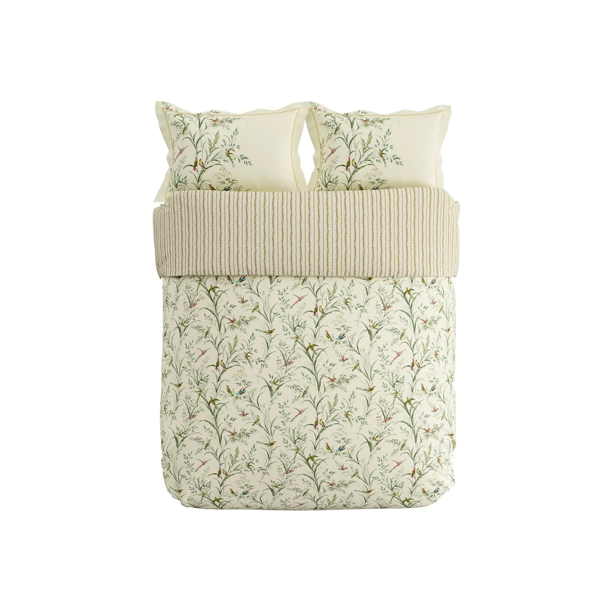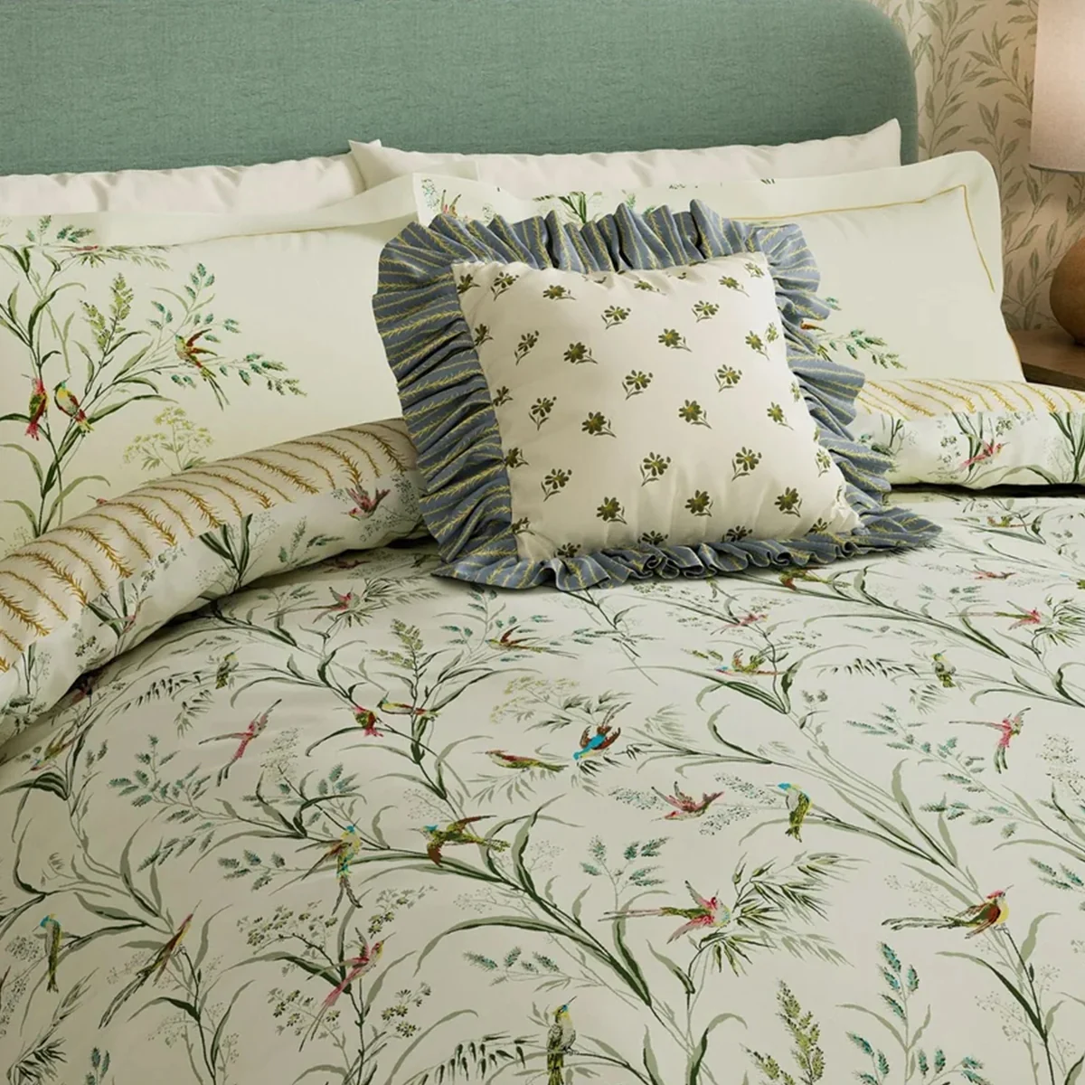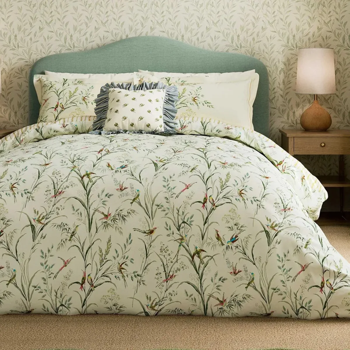 Sanderson Hummingbird duvet set with delicate birds and grasses, 200TC cotton sateen, with a leaf stripe reverse. Soft, stylish, and timeless.