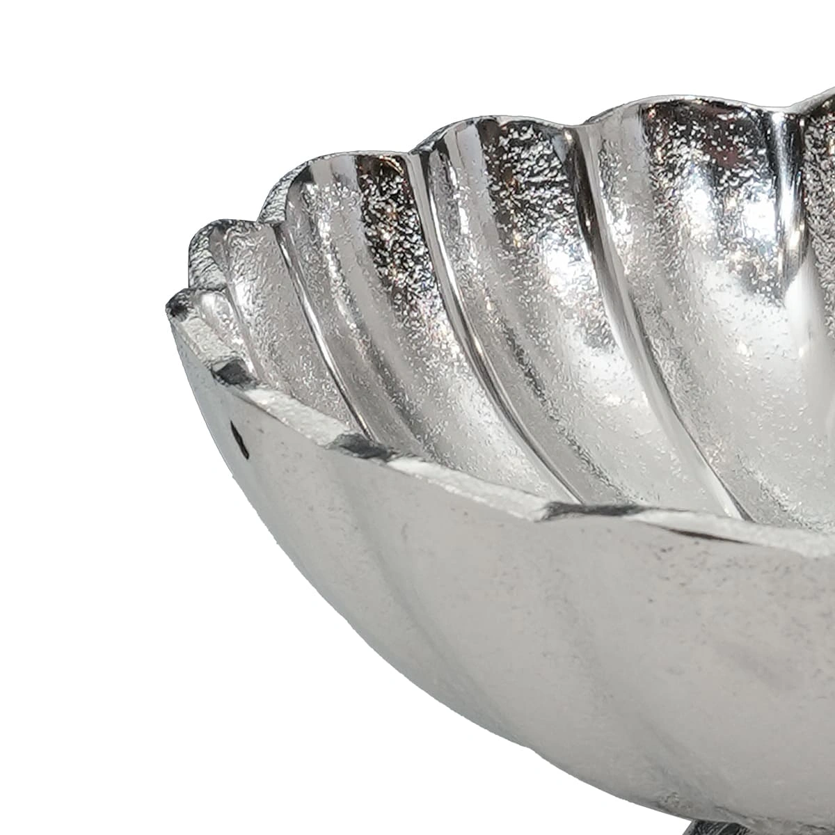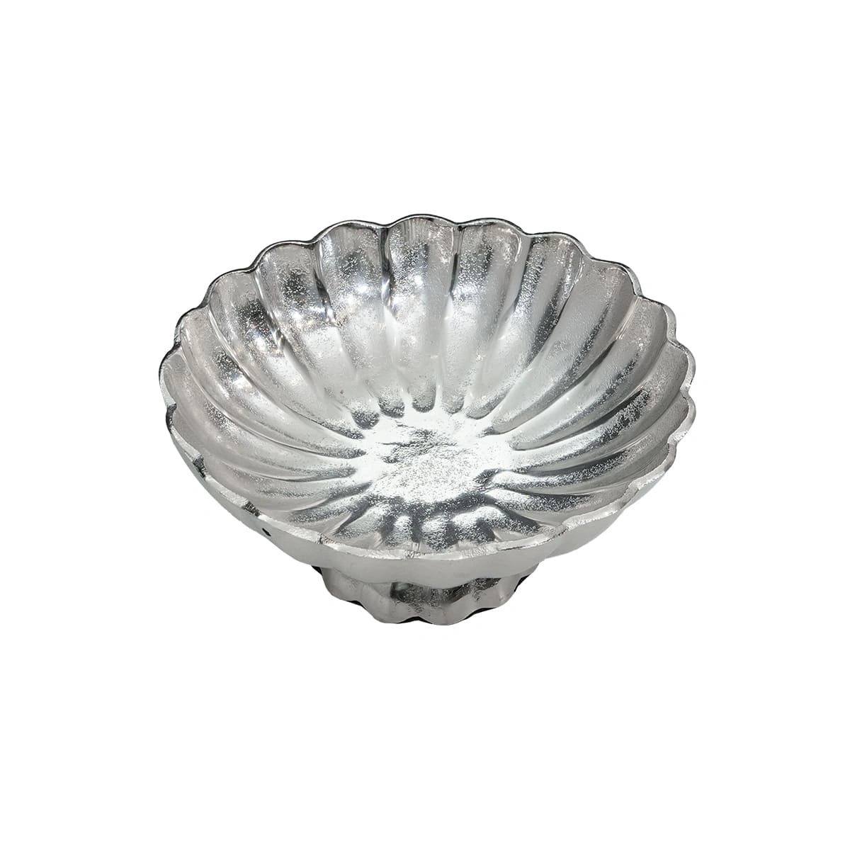 Bring an artistic touch to your space with our Small Scalloped Round Footed Bowl in Raw Silver Aluminium. This tastefully designed piece is perfect for enhancing any tabletop or console.