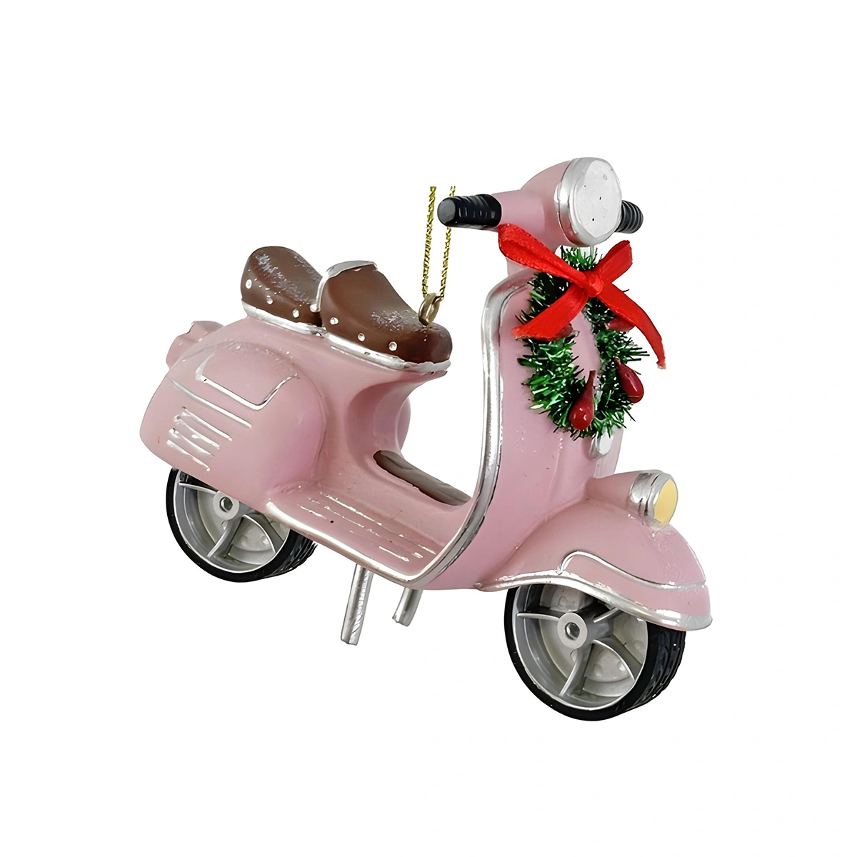 The Scooter Ornament in Pink adds a cheerful, retro touch to your decorations. Its bright finish and playful design capture the spirit of carefree adventure, perfect for fun holiday themes.