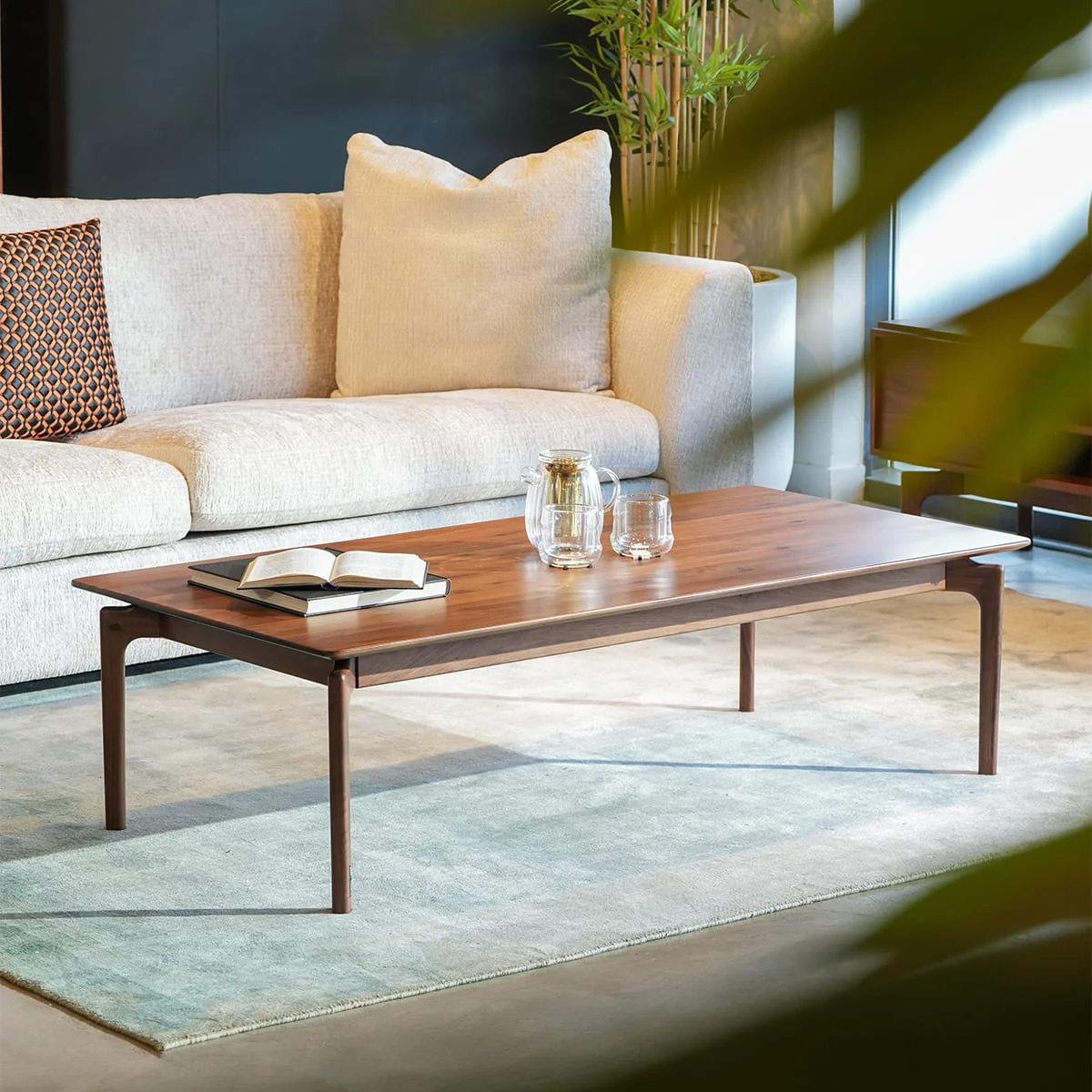 Define the space with the Sevier wooden coffee table in walnut. Crafted from solid walnut wood, it features a smooth lacquered top and tapered legs. The natural grain and minimalist form suit a range of interior styles. Suitable for holding drinks, books or decorative accents. Pairs well with other pieces from the Sevier collection.